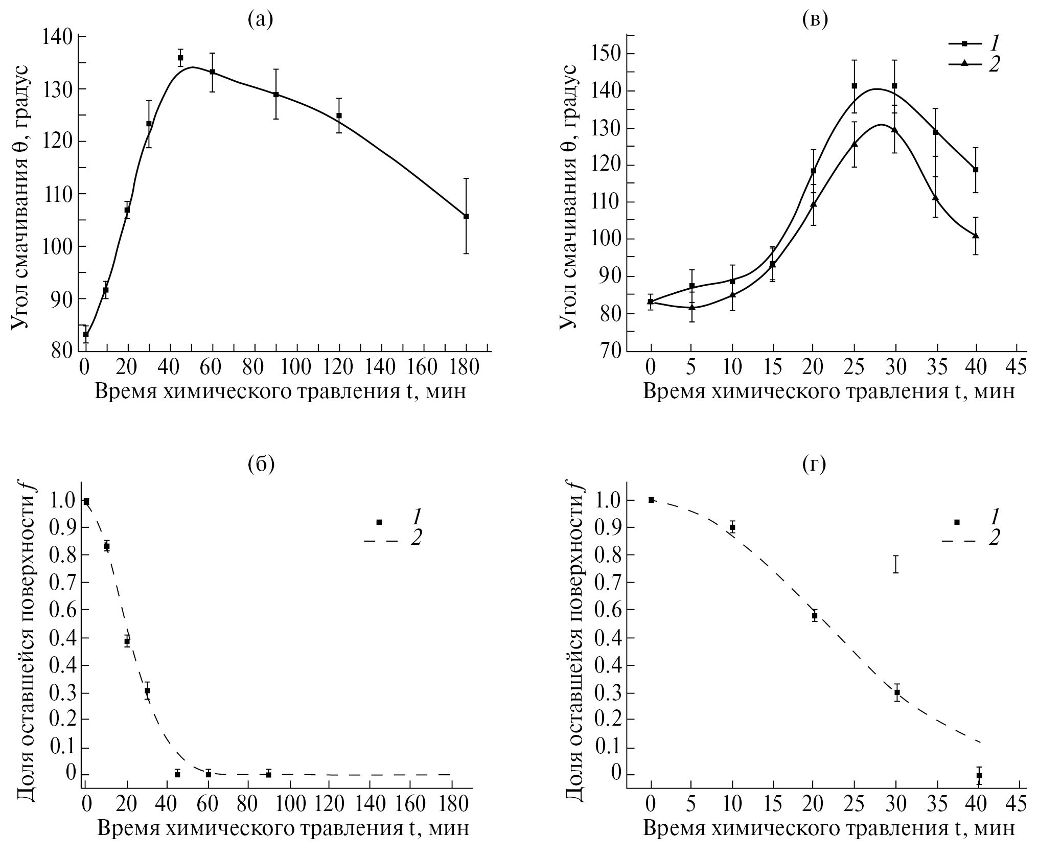 Травление образцов пленок размером 33 × 55 мм, закрепленных в тефлоновых держателях, проводили в термостатируемых стаканах. Держатели с образцами предварительно нагревали до температуры травильного раствора. После травления образцы промывали в деионизированной воде, сушили на воздухе и хранили на воздухе при комнатной температуре. Измерение углов смачивания проводили через 1–3 суток после травления.