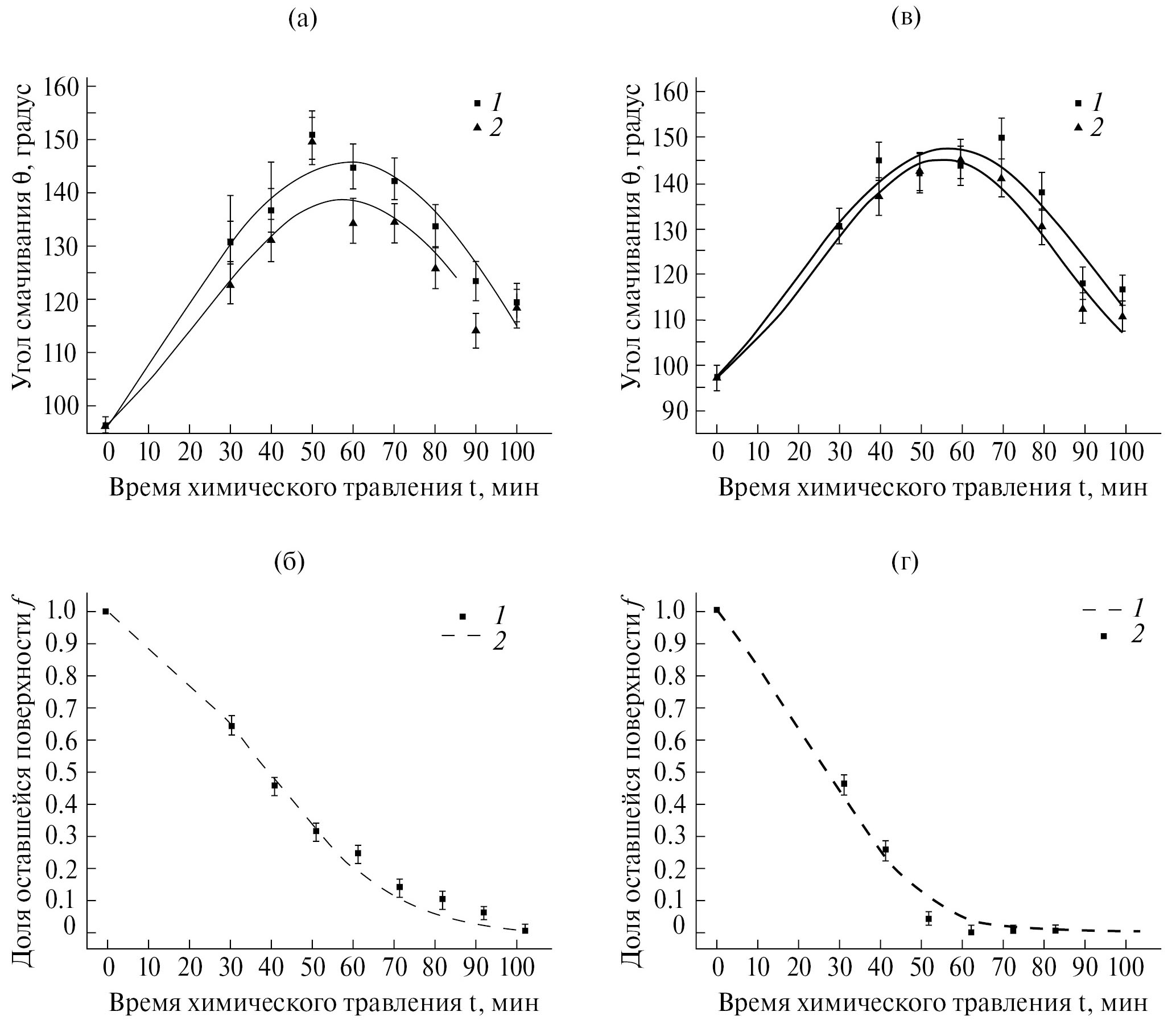 Рис. 8. Характеристики рельефов, полученных при травлении полипропилена, облученного под углом 45° (а, б) и 30° (в, г). а, в) зависимости краевых углов от времени травления. Гладкие кривые проведены от руки. На графиках приведены значения КУ слева (1) и справа (2). б, г) зависимости доли оставшейся поверхности от времени травления: 1 – экспериментальные данные, 2 – аппроксимирующие кривые, построенные при значениях VB = (4.98 ± 0.22) × 10–6 (б) и (4.98 ± 0.28) × 10–6 см/мин (г)