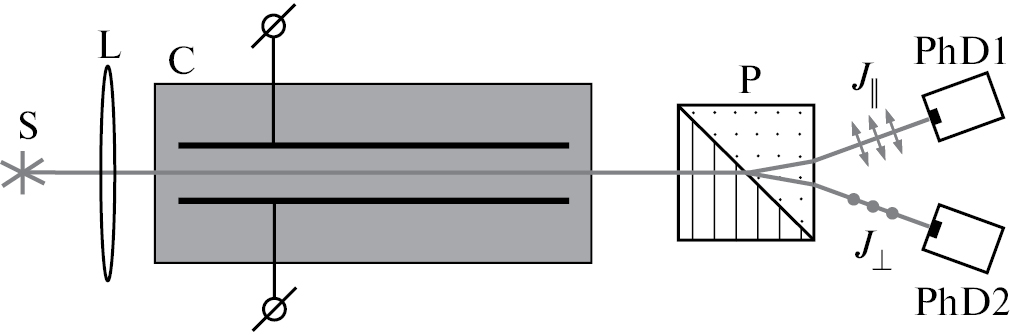 Рис. 1. Оптическая часть экспериментальной установки. S – источник белого неполяризованного света, L – длиннофокусная линза, C – кювета с плоскопараллельными электродами, к которым прикладывается электрическое поле, P – поляризационная призма, PhD1 и PhD2 – фотоприемники.