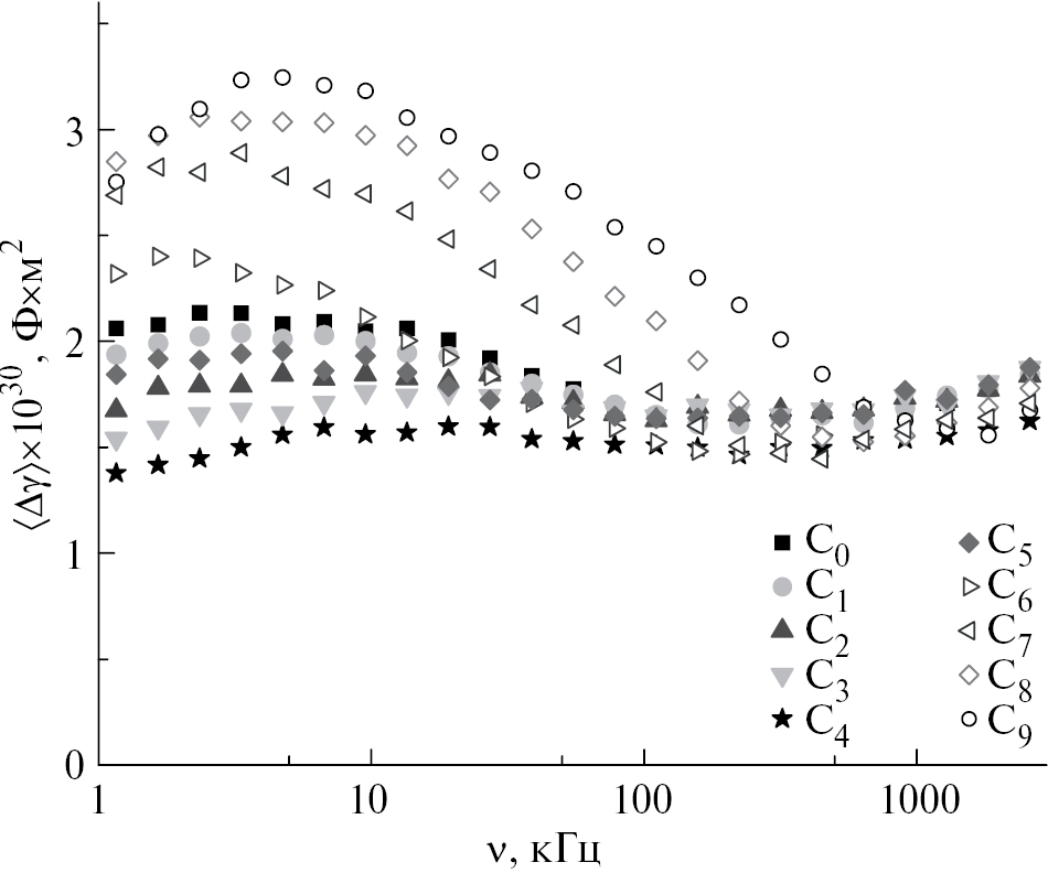 Рис. 4. Частотные зависимости ⟨Δγ⟩ в золях WO3 при Θ = 0.5 ⋅ 10−6. Концентрации (в μмоль/л) водных электролитов Th(NO3)4 в золях WO3: С0 – 0.0; С1 – 0.02; С2 – 0.05; С3 – 0.1; С4–0.3; С5–2.0; С6 – 3.0; С7 – 6.0; С8 – 10.0; С9 – 30.0.