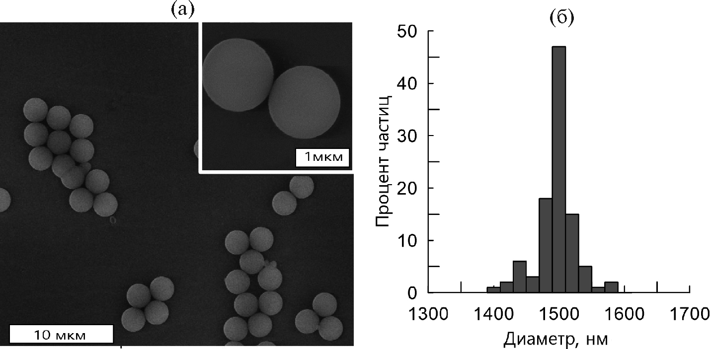 На вставке показано увеличенное изображение, демонстрирующее идеальную сферическую форму частицы. На рис. 2б приведена гистограмма распределения силикатных микрочастиц по размерам. Средний диаметр составил 1493 нм, а среднеквадратичное отклонение 21 нм. Для последующей адсорбции золотых нанозвезд силикатные микрочастицы были функционализированы аминопропилтриметоксисиланом для введения аминогрупп, обладающих положительным зарядом. Исходные силикатные микрочастицы в воде имели электрокинетический потенциал –31.4 ± 5.3 мВ. После процедуры аминирования величина электрокинетического потенциала составила +14.5 ± 5.7 мВ.