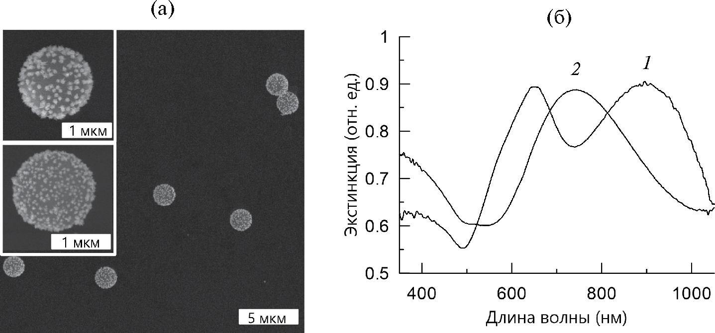 Рис. 3. Электронно-микроскопические изображения двух типов композитных ГКР-меток с большими (SiO2/НЗВ1) и малыми (SiO2/НЗВ2) звездами на поверхности силикатных микросфер (а). Масштабная шкала 1 мкм. Спектры экстинкции композитных ГКР-меток (б). Спектр 1 – для образца (SiO2/НЗВ1), спектр 2 – для образца (SiO2/НЗВ2).