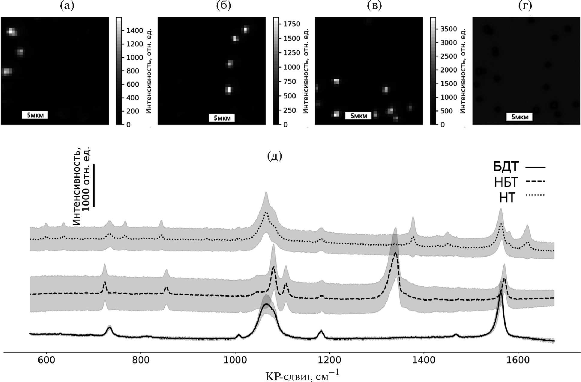 Рис. 6. ГКР-картирование области с нанесенной смесью микрочастиц, кодированных различными ароматическими тиолами. Изображение декодировано по интенсивности характерной линии бензендитиола при 1563 см–1 (а), нафталентиола – при 1385 см–1 (б), нитробензентиола – при 1335 см–1 (в). Панель (г) показывает оптическое микроскопическое изображение сканируемой области. Панель (д) показывает типичные ГКР-спектры исследуемых микрочастиц и вариации интенсивности (среднее значение и стандартное отклонение) линий комбинационного рассеяния.