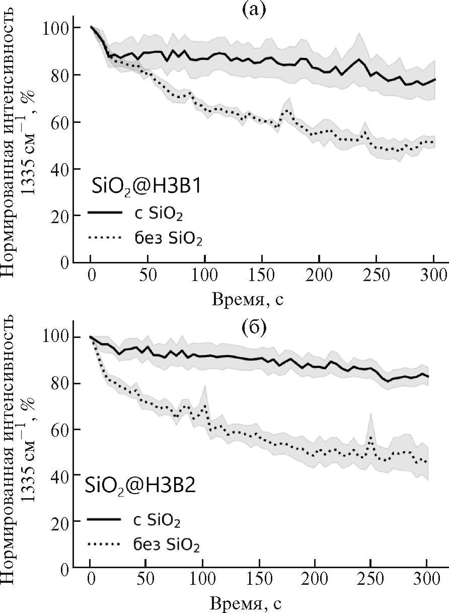 Стабильность ГКР-сигнала является ключевым параметром, определяющим эффективность использования таких меток для многих приложений. Несмотря на то, что комбинационное рассеяние гораздо в меньшей степени подвержено фотообесцвечиванию по сравнению с флуоресценцией, возможный разогрев металлических наночастиц под действием резонансного лазерного облучения может приводить к фотохимическим реакциям репортерных молекул и падению интенсивности ГКР. Другим возможным механизмом фотообесцвечивания ГКР-меток является плавление металлических наночастиц, в результате которого происходит полное исчезновение сигнала ГКР. В данной работе мы исследовали эффекты фотообесцвечивания разработанных ГКР-активных микрочастиц при облучении сфокусированным лазерным излучением в течение 300 секунд. Данное время значительно превышает типичные времена накопления сигнала в точке для всех видов ГКР-исследований. На рис. 7 показаны данные изменения интенсивности ГКР для образцов с адсорбированными НЗВ1 (а) и НЗВ2 (б), покрытых и непокрытых вторичной стабилизирующей силикатной оболочкой. В качестве репортерной молекулы использовали нитробензентиол.