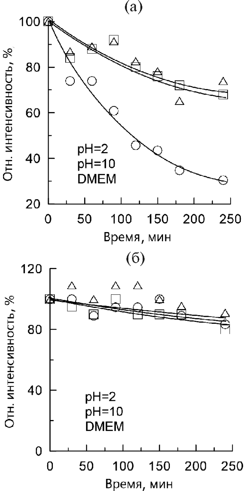 Рис. 8. Изменение относительной интенсивности комбинационного рассеяния от образцов с адсорбированными НЗВ1 для микрочастиц непокрытых (а) и покрытых (б) силикатной оболочкой при инкубации в среде с pH = 2 (кружки), pH = 10 (квадраты) и культуральной клеточной среде DMEM (треугольники). В качестве репортерной молекулы использовали нитробензентиол. Исследовали значение интенсивности линии, соответствующей вибрации нитрогруппы.
