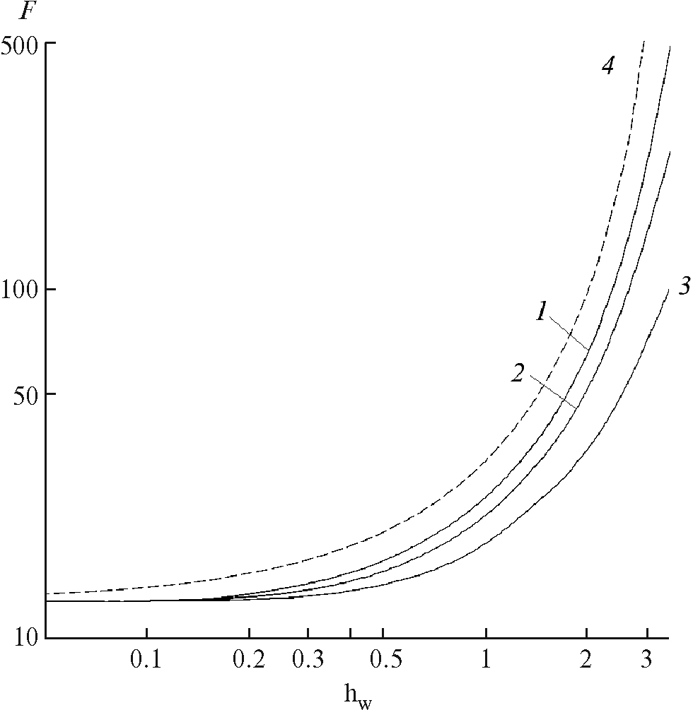 Рис. 2. Зависимости силы сопротивления волокна с иголочками от длины иголочек hw при разных расстояниях между слоями иголочек по оси волокна ξ = 0.2 (1), 0.4 (2), 1 (3); 4 – сила сопротивления непроницаемого волокна с эквивалентным радиусом 1 + hw, по формуле (14): число иголочек в поперечном сечении N = 8, безразмерный радиус иголочки aw = 0.025, Kn = 0.