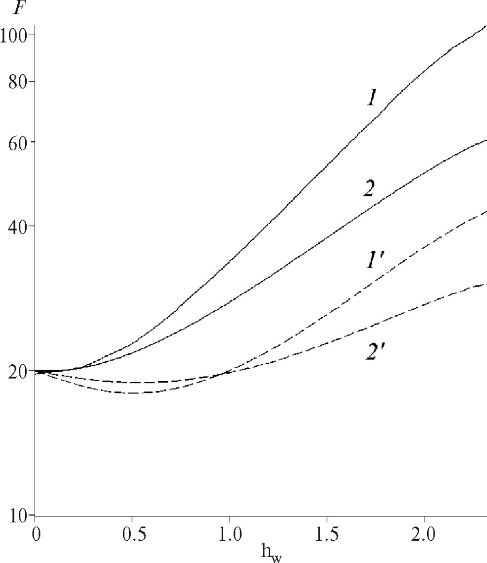 Рис. 3. Зависимости сил сопротивления волокна с «шубой» из иголочек (1, 2) и волокон-стержней, экранированных слоем иголочек, от hw: (1, 1') – N= 8, (2, 2') –N = 4; ξ = 1, b = 0.3.