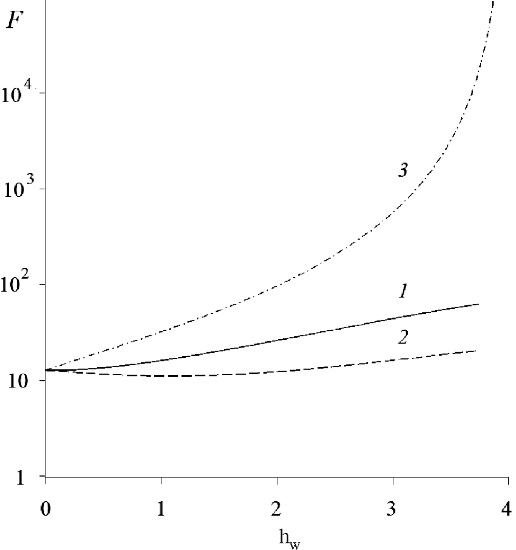 Рис. 4. Зависимости сил сопротивления волокон с «шубами» из радиальных иголочек (1–3) от длины иголочек для разных плотностей упаковки волокон b = 0.2; 2 – волокно-стержень, экранированное слоем иголочек, 3 – эквивалентное непроницаемое волокно с радиусом 1 + hw; ξ = 1, aw = 0.025, N = 4.