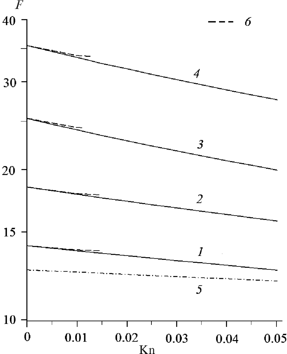 Рис. 5. Зависимости силы сопротивления волокна с иголочками от числа Кнудсена Kn, полученные линейной экстраполяцией расчетных зависимостей 1/F (модель течения с граничным условием скольжения, Kn << 1, кривые 6) на область промежуточных чисел Kn: hw = 0.5 (1), 1 (2), 1.5 (3), 2 (4), 0 (5); a0 = 1.5 мкм, aw = 0.025, b = 0.2, ξ = 1, N = 8.