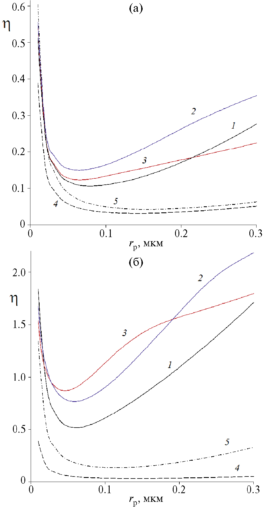 Рис. 9. Зависимости коэффициентов захвата от радиуса частиц при hw = 1 (a), 3 (б), где ξ = 1 (1), 0.4 (2), 0.2 (3); 4 – стержень без слоя иголочек, 5 – непроницаемое волокно эквивалентного внешнего радиуса, Kn = 0, b = 0.2, параметры те же, что и на рис. 8.