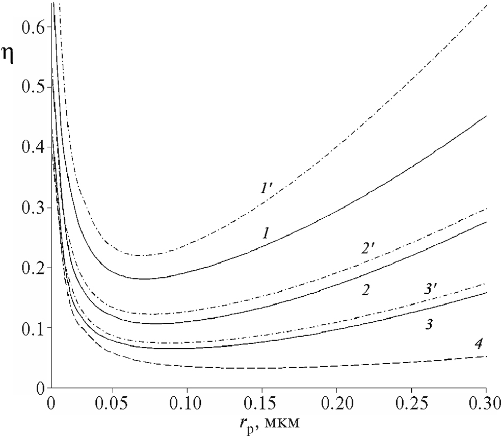 Рис. 10. Зависимости коэффициентов захвата волокном с «шубой» из иголочек от радиуса частиц для hw = 1.5 (1, 1'), 1 (2, 2'), 0.5 (3, 3'), 0 (4) без учета (1 – 4) и с учетом эффекта скольжения газа при Kn = 0.043 (1'–3') b = 0.2, ξ = 1, a0 = 1.5 мкм, aw = 0.025, U = 10 см/с, N = 8.