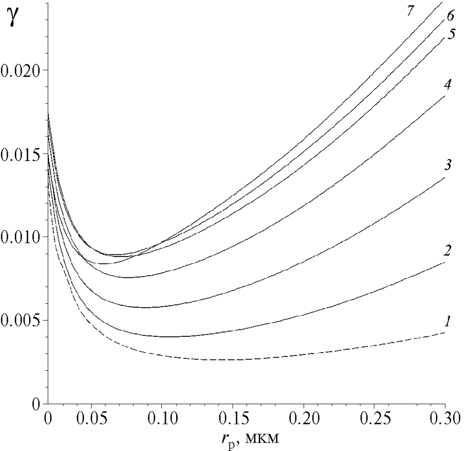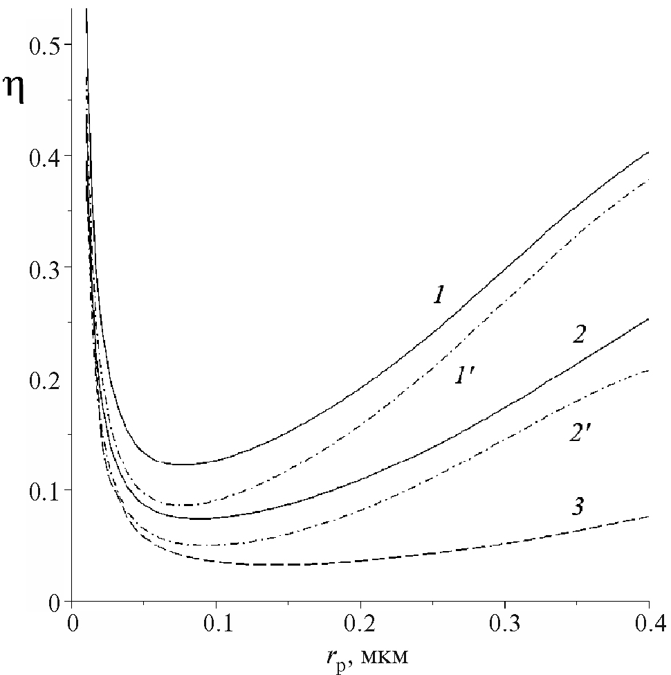 Осаждение субмикронных частиц конечного размера за счет диффузии и зацепления. Аэрозольные частицы субмикронного размера при обычной для режима тонкой фильтрации скорости, не превышающей 10 см/с, осаждаются также в основном благодаря броуновской диффузии. Но при вычислении коэффициента захвата следует учитывать собственный размер частиц и, следовательно, учитывать их свойства. Однако в практике тонкого обеспыливания при оценке эффективности НЕРA-фильтров считается достаточным учитывать дополнительно только размер частиц, принимая при этом, что частица имеет сферическую форму, и использовать формулу Ленгмюра для эффективности фильтра, в которой параметр, характеризующий зацепление частицы, пропорционален квадрату отношения радиусов частицы и волокна. При этом число Кнудсена, определенное по наноиголочкам, всегда велико. Однако, ожидаемый большой эффект от скольжения газа на иголочках ограничен влиянием диффузии, т.к. число Пекле иголочек невелико, и диффузия доминирует над конвекцией. Однако, как увидим, и в этом случае влияние эффекта скольжения дает заметный рост критерия качества. На рис. 8–12 показаны результаты расчетов осаждения аэрозольных частиц конечного размера на волокно с «шубой» из наноиголочек в зависимости от радиуса частиц и геометрических параметров hw и b при U = 10 см/с и aw = 0.025. В рассмотренном примере число Кнудсена, определенное по волокну-стержню Kn = λ/a0 = 0.043, соответствует достаточно большому числу Кнудсена для наноиголочек, равному Knw = λ/ = 2.58, когда влияние эффекта скольжения газа для иголочек весьма существенно. Во всех случаях с увеличением размера частиц справа от минимума на кривых η(rp) эффект скольжения заметно увеличивает коэффициент захвата. На рис. 11 показаны зависимости коэффициентов захвата волокном с иголочками разной длины от радиуса частиц, рассчитанные с учетом эффекта скольжения газа, откуда следует, что в области максимально проникающих частиц эффективность осаждения частиц растет с учетом эффекта скольжения, причем эффект скольжения не влияет на положение минимума η(rp), т.е. на оценку радиуса наиболее проникающих частиц. На рис. 12 даны результаты сравнения величин критерия качества фильтров с иголочками разной длины в зависимости от размера частиц. Во-первых, из этого рисунка следует, что с увеличением длины иголочек величина γ возрастает, причем область минимума резко смещается в сторону меньших размеров частиц. Здесь важно отметить, что в данном примере длина иголочек hw ≈1.5 a0 является оптимальной, т.е. дальнейшее увеличение длины иголочек не ведет к существенному увеличению γ. Во-вторых, величина γ резко растет в области минимума эффективности исходного фильтра при rp ≈ 0.15 мкм. На этом рисунке видно, как сильно эффект скольжения газа на иголочках влияет на расчетную величину критерия качества (из сравнения кривых 2 и 2', где пунктирная кривая 2', рассчитана без учета скольжения).