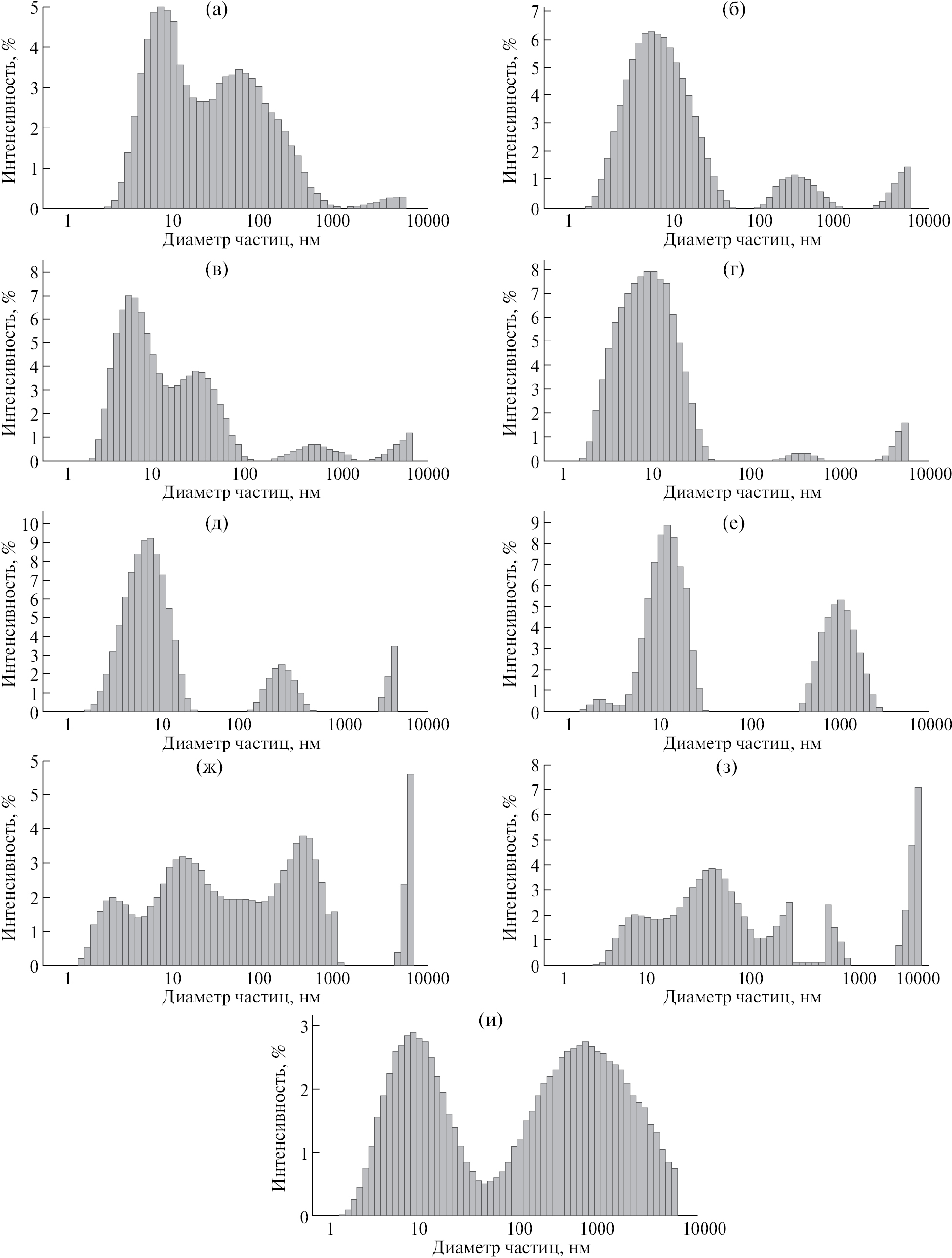 Рис. 2. Распределение частиц по величине гидродинамического диаметра перед достижением условного времени гелеобразования в процессе гидролиза ТЭОС при 50оС с добавлением Fe3+: а, г, ж – 1.5 ат. %; б, д, з – 2.3 ат. %; в, е, и – 3.8 ат. %. Значения рН: а, б, в – 1.5; г, д, е – 2.5; ж, з, и – 5.0.