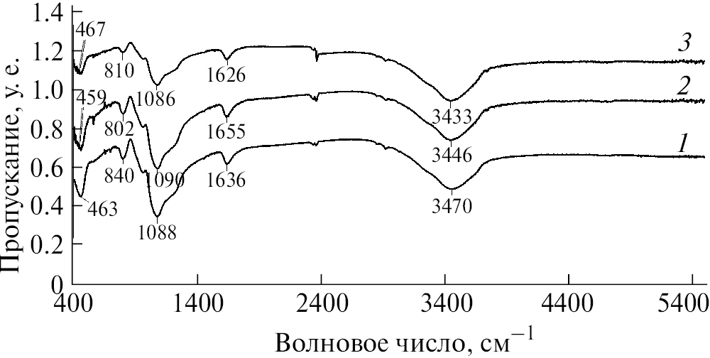 Рис. 3. ИК-спектры кремнеземов, легированных катионами железа, при рН гидролиза 1.5: 1 – 1.5 ат. %; 2 – 2.3 ат. %, 3 – 3.8 ат. %.