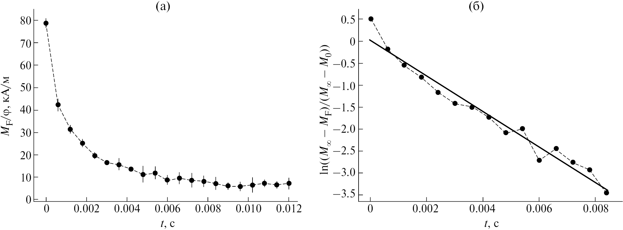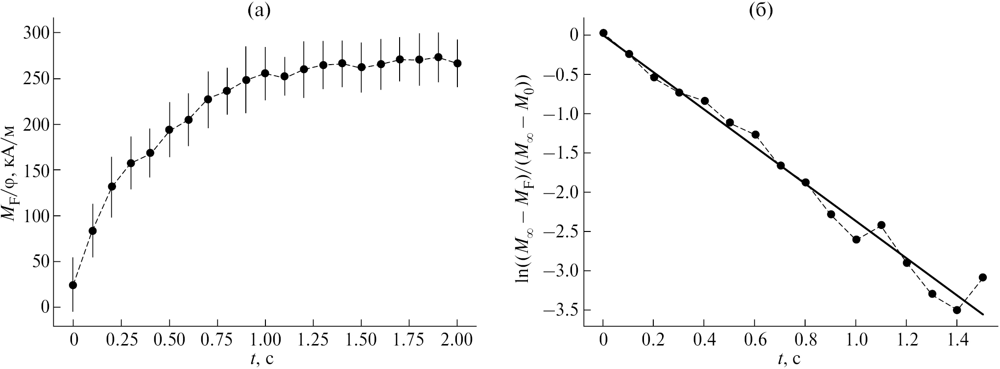 Рис. 2. Зависимости средней намагниченности одной частицы (a) и натурального логарифма относительной намагниченности (б) системы частиц от времени t. Вертикальные отрезки показывают стандартное отклонение от среднего. Характеристики системы: вязкость несущей среды η = 0.13 Пa·сек; намагниченность насыщения материала частиц Ms = 5·105 A/м (магнетит); объемная концентрация частиц φ = 0.5%; температура T = 298 K; диаметр частиц d = 16 нм; параметр диполь-дипольного взаимодействия λ = 7; параметр Ланжевена κ возрастает от 0.0336 до 0.336. Сплошная линия на рис. (б) – линейная регрессия (16).
