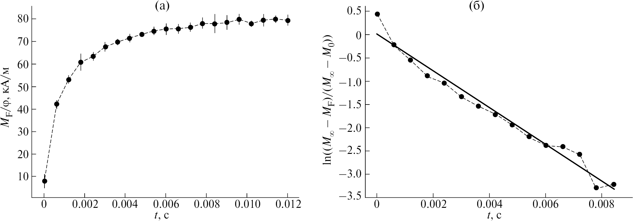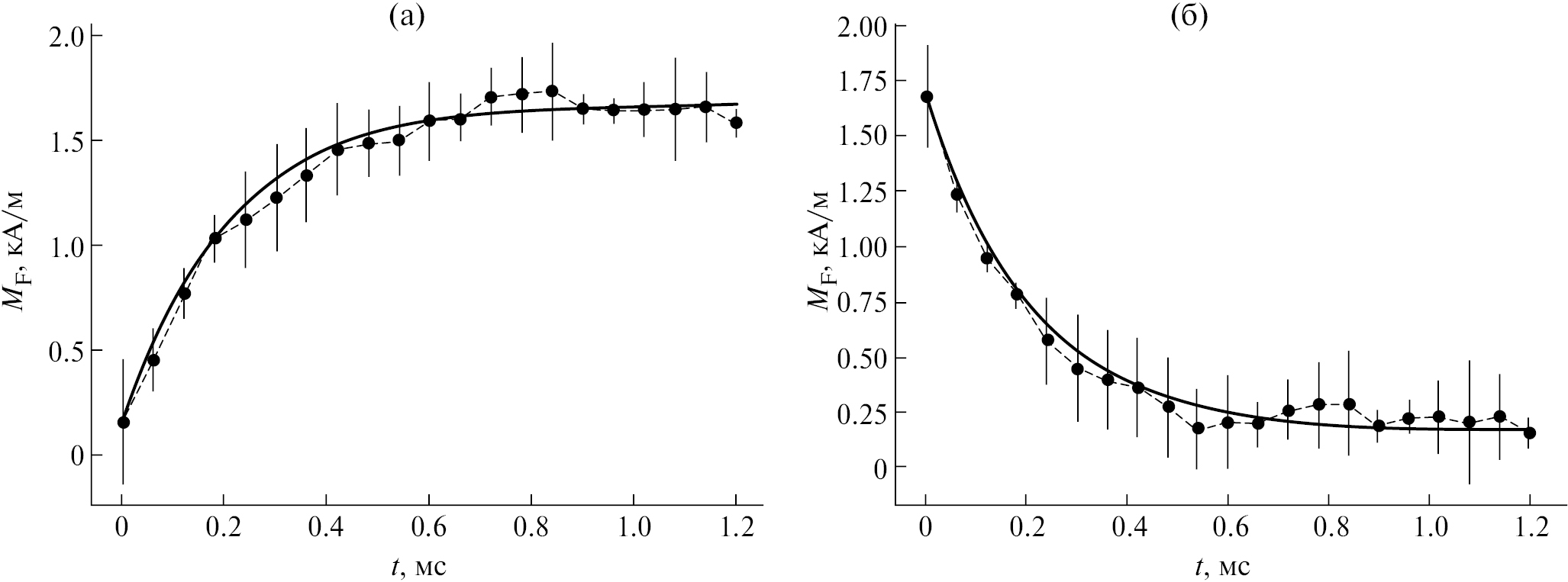 Рис. 5. Намагниченность феррожидкости в зависимости от времени при λ = 0. Диаметр магнетитовых частиц d = 16 нм. Остальные параметры такие же, как на рис. 2. Сплошные линии – теоретические результаты, полученные с использованием (14). (а) – параметр Ланжевена κ возрастает от 0.0336 до 0.336 (магнитное поле H скачкообразно возрастает от 0.1 кА/м до 1 кА/м); (б) – κ убывает от 0.336 до 0.0336 (H ступенчато уменьшается от 1 кА/м до 0.1 кА/м).