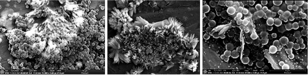 Электронно-микроскопические фотографии частиц латекса, синтезированных в статической гетерогенной системе стирол–водный раствор ПК в присутствии ЦС, представлены на рис. 7. На этих фотографиях хорошо видны игольчатые кристаллы и «конус роста» на поверхности ПМЧ. На этих фотографиях также видны очень мелкие сферические частицы, состав которых пока не очень ясен.