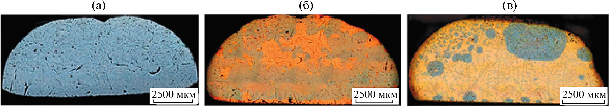 Общий вид образцов представлен на рис. 4. По внешнему виду их можно разделить на две группы богатые кобальтом (Co–20 ат. % Cu–С и Co–40 ат. % Cu–С) и медью (Сo–60 ат. % Cu–С). Для обеих групп характерно расслоение расплава с вытеснением медной фазы на периферию образца. Для образцов первой группы происходит обособление медной фазы, а для образцов второй группы – фазы, богатой кобальтом. Ранее обращение фаз при переходе через эквиатомный состав было зафиксировано для расплавов Fe–Cu при смачивании графита [12–13]. Расслоение образца Co–60 ат. % Cu–С происходит во всем объеме (рис. 4в). Для сплавов Co–20 ат. % Cu–C и Co–40 ат. % Cu–C характерна достаточно однородная структура. Ранее способом контактного легирования расплава Fe–Cu углеродом получен аналогичный результат: расслоение образца Fe–60%Cu–С происходило во всем объеме [12–13]. Следовательно, получение объемных макро однородных образцов металл-углеродных материалов Co–Cu–С по технологии контактного легирования расплавов Co–Cu углеродом при низких скоростях охлаждения (1–10 °C/с) возможно при избытке кобальта в расплаве.