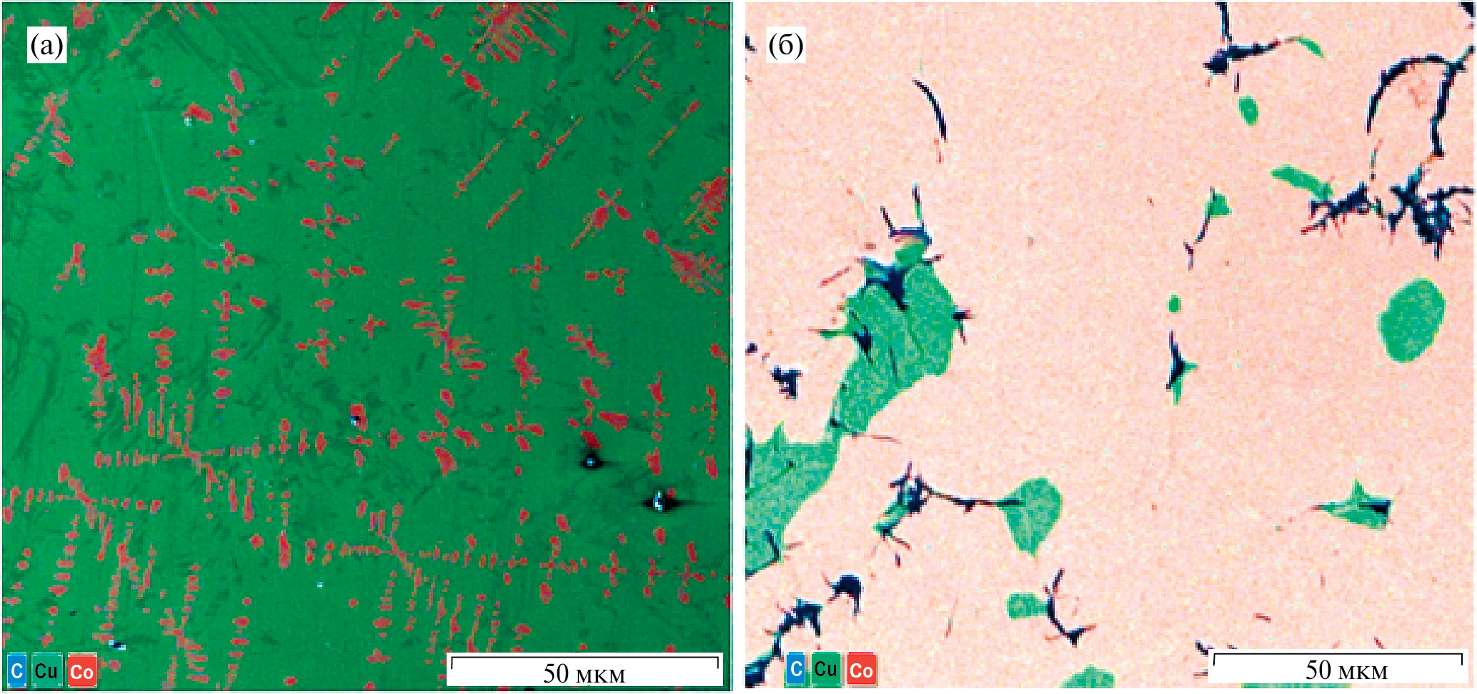 Рис. 7. Структура металл-углеродного материала Co–20%Cu–С: а) Cu зона с дендритами Co; б) обособленные зоны Co–C эвтектики с включениями медной фазы, EDS-карты распределения элементов (СЭМ).
