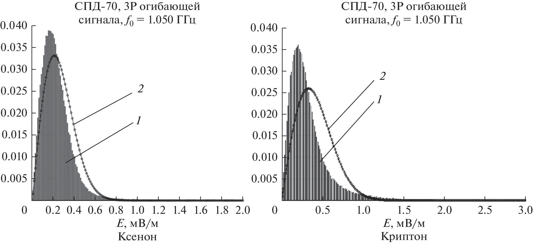 The procedure of experimental determination of statistical characteristics of own electromagnetic radiation of a laboratory mock-up of an SPT-70 stationary plasma thruster developed by the Research Institute of Applied Mechanics and Electrodynamics of the Moscow Aviation Institute is described. The study investigated the temporal complex implementation of the processes of radiation of the SPT-70 with a sampling duration of 1 ms and an analysis band of 140 MHz for characteristic central frequencies of 0.9, 1.050, 1.200, and 1.350 GHz (discharge power of 600 W, horizontal polarization) when working on various working bodies. The conducted studies allowed to obtain estimates of the statistical characteristics of the SPT-70 radiation for prospective working bodies The new results should be attributed to the fact that the obtained distribution laws for the common-phase and quadrature components of the complex envelope process of radiation differ significantly from the Gaussian one. As for the distribution of the amplitude envelope process, in general, there is a difference from the Rayleigh distribution law. In the transition from xenon to krypton, the degree of negativity and the difference from Rayleigh’s law increase. At the same time, the law of phase distribution of the complex envelope process is close to uniform and invariant to the type of working body.
