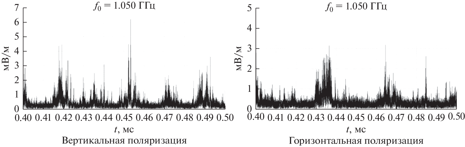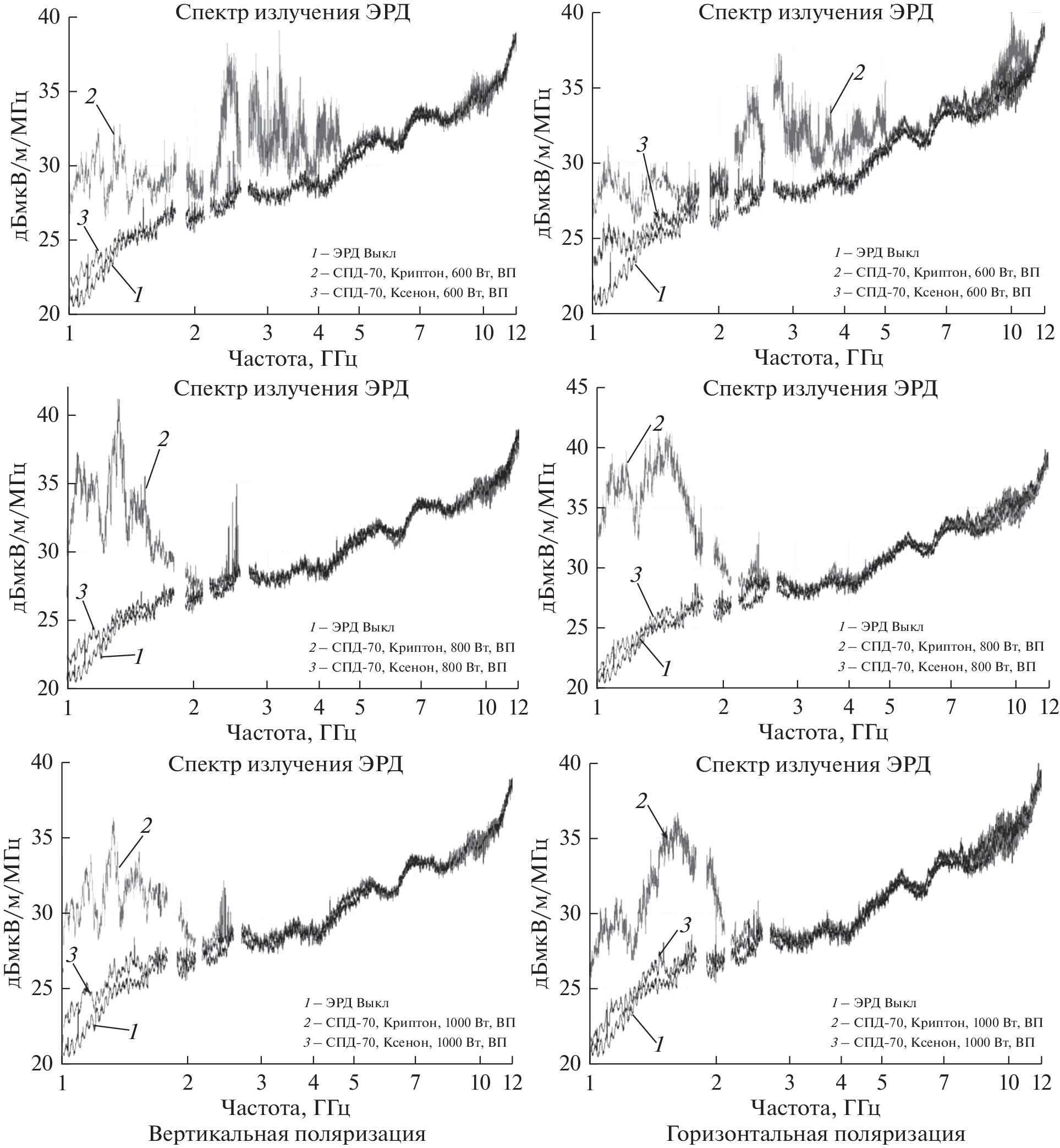 Possible aspects of violation of the functional safety of spacecraft in terms of electromagnetic compatibility with electric rocket thrusters in their work on alternative working substances are considered. The procedure of experimental determination of spectral–time characteristics of own electromagnetic radiation of laboratory model of stationary plasma thruster SPT-70 developed by the Research Institute of Applied Mechanics and Electrodynamics of the Moscow Aviation Institute is described. Measurements of noise emissions were carried out on a vacuum installation with a “radiotransparent” compartment and a shielded echo-free camera in the frequency range of 1–12 GHz for typical discharge capacities (600, 800, and 1000 W), vertical and horizontal polarization, and various working substances used (krypton and xenon). The conducted studies have allowed obtaining new comparative results of the assessment of spectral characteristics of SPT-70 radiation for standard modes and prospective working bodies within the orthogonal polarization bases. The new results should include information about the radiation characteristics of SPT-70 in the time area. It is shown that the transition from xenon to krypton retains the pulsed nature of the radiation of a stationary plasma thruster, leading not only to an increase in the amplitude of pulses, but also to an increase in the frequency of repetition of “bursts” and an increase in their duration, which requires additional measures to ensure electromagnetic compatibility in order to preserve the functional safety of the spacecraft.