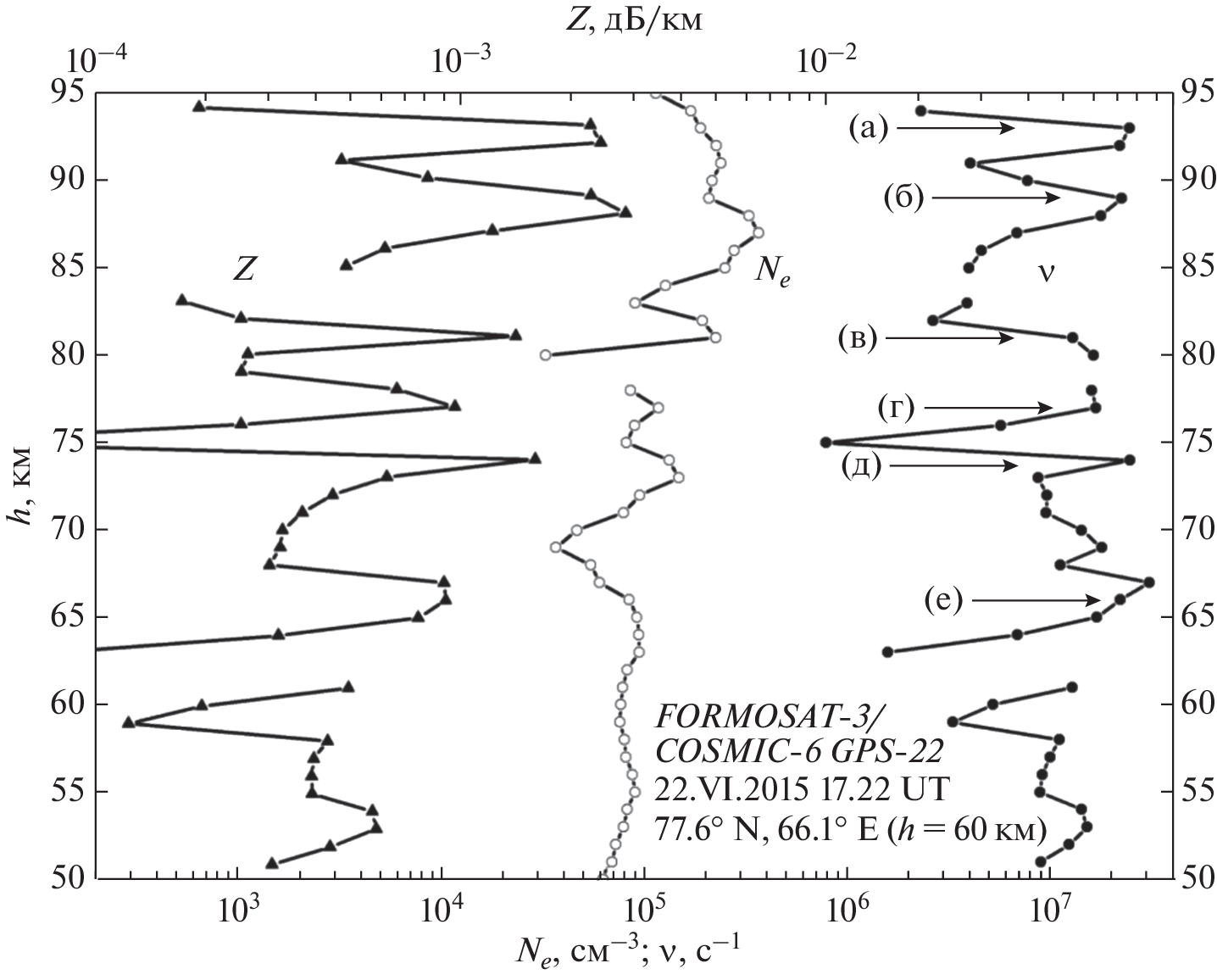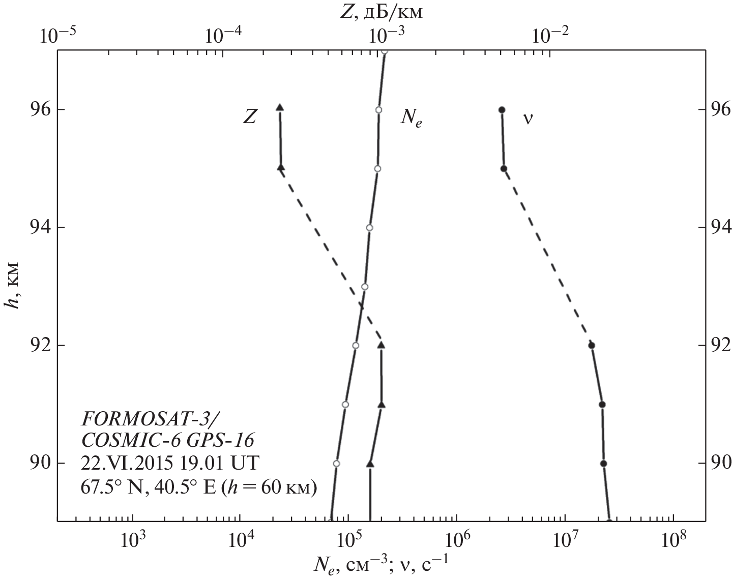 Изучение столкновений между электронами и нейтральными молекулами представляет особый интерес для физики ионосферы Земли, в частности, с точки зрения определения ионосферной проводимости и токовых систем в нижней ионосфере планеты и выяснения роли, которую эти столкновения играют в ослаблении радиоволн, распространяющихся внутри D- и Е-областей ионосферы. Эффективную частоту столкновений электронов можно оценить по лабораторным исследованиям подвижности электронов в атмосферных газах в сочетании с ракетными измерениями температуры и плотности частиц в верхней атмосфере Земли, также ее можно определить независимо из анализа радиозатменных данных. Нами разработан метод восстановления вертикальных профилей коэффициента поглощения дециметровых (длина волны ∼19 см) радиоволн, базирующийся на решении обратной задачи о поглощении сигнала в D- и Е-областях ионосферы Земли. По результатам анализа радиозатменных данных спутников FORMOSAT-3/COSMIC были определены высотные профили коэффициента поглощения дециметровых (ДМ) радиоволн в ионосфере планеты во время магнитной бури 22–23.VI.2015. Известно, что величина коэффициента поглощения на данной фиксированной частоте прямо пропорциональна произведению электронной плотности и частоты столкновений электронов с ионами и нейтралами. С использованием полученных данных о вертикальных профилях коэффициента поглощения ДМ-радиоволн и электронной плотности, восстановленных из анализа радиозатменных данных FORMOSAT-3/COSMIC, была оценена эффективная частота столкновений электронов в D- и Е-областях высокоширотной ионосферы Земли. Практическая значимость изучения частоты столкновений электронов и эффектов поглощения радиоволн в D- и Е-областях ионосферы планеты связана с обеспечением бесперебойной работы систем космической радиосвязи и навигации.