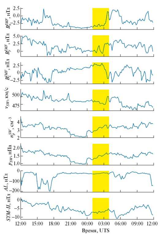 На рис. 1 показан пример анализа типичного интервала 14.VI.2017 в 01:00–04:00 UT. Во время измерений координаты спутников в системе координат GSM были: X = –(22.6– 22.1) RE, Y = –(7.6– 7.1) RE, Z = (2.3– 3.4) RE. На рис. 1а показаны параметры солнечного ветра, межпланетного магнитного поля и геомагнитные индексы для данного события согласно базе данных OMNI c минутным разрешением: скорость солнечного ветра была в пределах vSW = 471– 505 км/с, плотность nSW = 2.6– 3.9 см−3, давление pSW = 1.2– 1.8 нПа; компоненты межпланетного магнитного поля: ВxIMF = –(3.9–2.1) нТл, ВyIMF = –(1.6–3.1) нТл, ВzIMF = 3.5–2.7 нТл; геомагнитные условия были спокойными: Kp = 0–1–, SYM-H = –(9–6) нТл, AL = –(31–17) нТл.