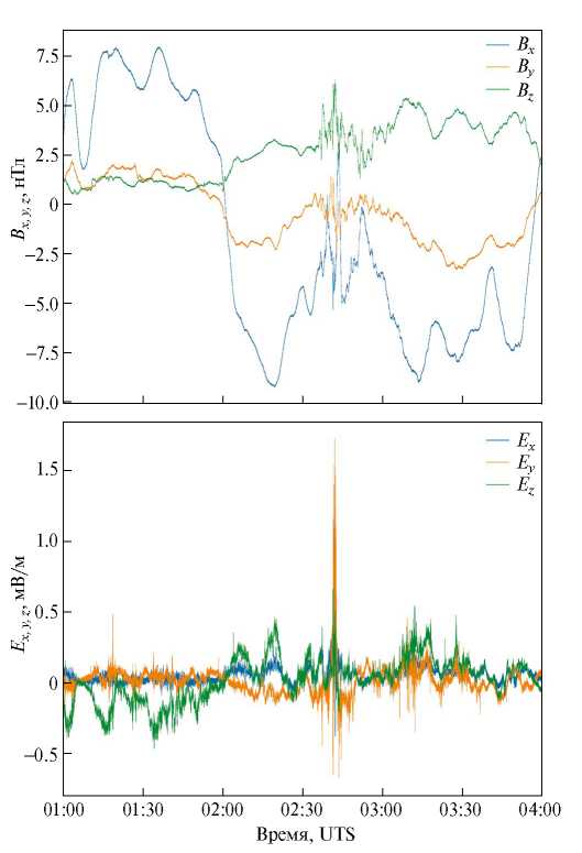 Рис. 1б. Флуктуации магнитного (Bx, By, Bz) и электрического (Ex, Ey, Ez) поля в интервале 14.VI.2017 в 01:00–04:00 UT по данным с MMS-1.