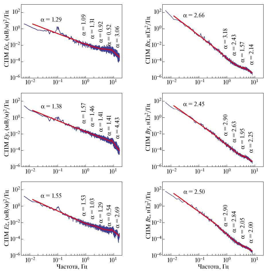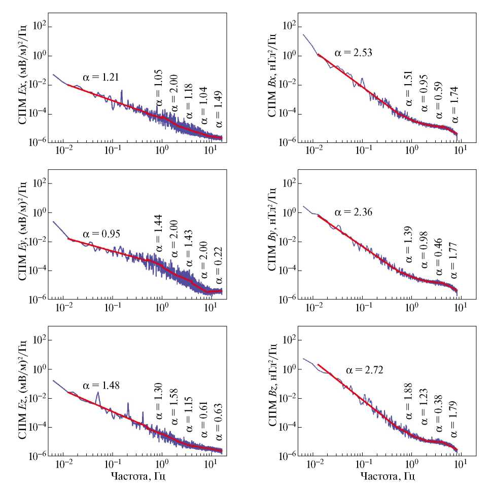 На приведенных на рис. 2 и 4 спектрах наблюдаются степенные участки на частотах ниже 0.5 Гц. Показатели наклона спектров электрического поля значительно отличаются от показателей наклона магнитного поля. При этом различия между спектрами x-, y- и z-компонент незначительны.