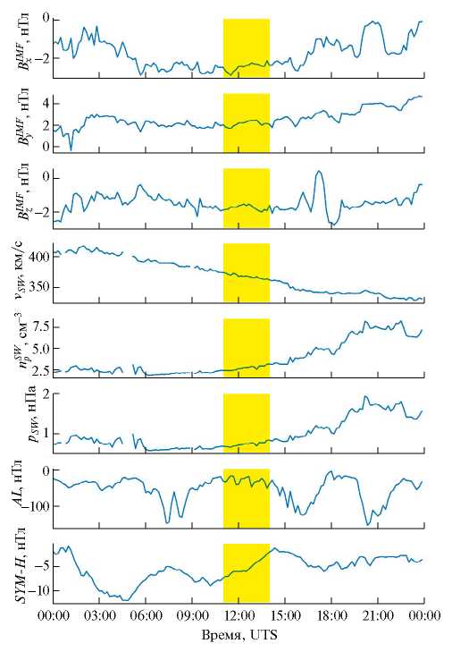Рис. 3а. Параметры ММП и солнечного ветра, геомагнитной активности для интервала 15.VII.2018 в 11:00–14:00 по одноминутным данным OMNI. Фоном отмечен анализируемый интервал времени.