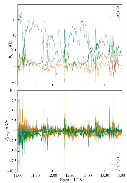На рис. 3а, б аналогично рис. 1а, б приведены параметры межпланетного магнитного поля, солнечного ветра, геомагнитной активности и флуктуации магнитного и электрического поля для более активного интервала 15.VII.2018 в 11:00–14:00 UT. Во время измерений координаты спутников в системе координат GSM были: X = –(22.4–21.5) RE, Y = (1.8–2.7) RE, Z = (6.7– 7.3) RE. Параметры солнечного ветра, межпланетного магнитного поля и геомагнитные индексы для данного события по данным OMNI c минутным разрешением: скорость солнечного ветра была в пределах vSW = 370–360 км/с, плотность в пределах nSW = 2.4–3.3 см−3, давление pSW = 0.64–0.86 нПа; компоненты межпланетного магнитного поля: ВxIMF = –(2.6– 2) нТл, ВyIMF = (1.9–2.9) нТл, ВzIMF = –(2.2–1.2) нТл; геомагнитные условия также были спокойными: Kp = 0–1–, SYM-H = –(8–2) нТл, AL = –(79–8) нТл.
