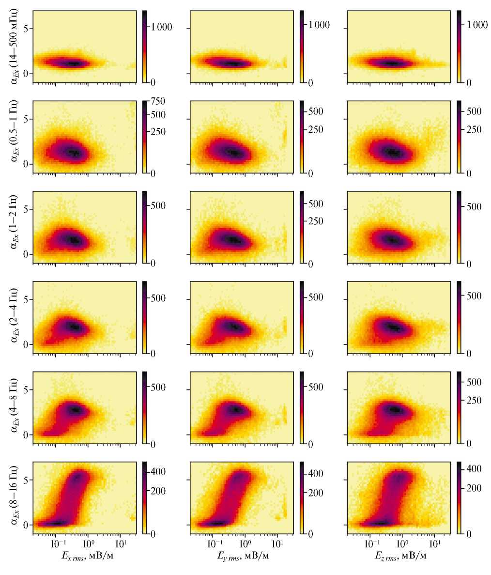 Анализ рис. 2 и 4 выявил возможность существования зависимости показателей спектров от уровня магнитных флуктуаций. Для проверки данного предположения были построены зависимости усредненных показателей спектра от усредненных уровней компонент электрического поля и магнитного поля. На рис. 5, 6 показаны двумерные гистограммы спектральных индексов для х-компонент электрического и магнитного поля в зависимости от усредненных по интервалу компонент электрического и магнитного поля. Двумерные гистограммы для других компонент и перекрестные гистограммы содержатся в дополнительном материале. Каждая точка соответствует одному 12-минутному интервалу. Уровень разброса точек характеризует разброс полученных значений. Как указано выше, близкие к нулю значения показателей спектра не имеют физического значения и соответствуют уровню флуктуаций, не превышающему уровня шумов приборов. В ряде случаев наблюдается тенденция уменьшения наклона спектра с ростом уровня флуктуаций.