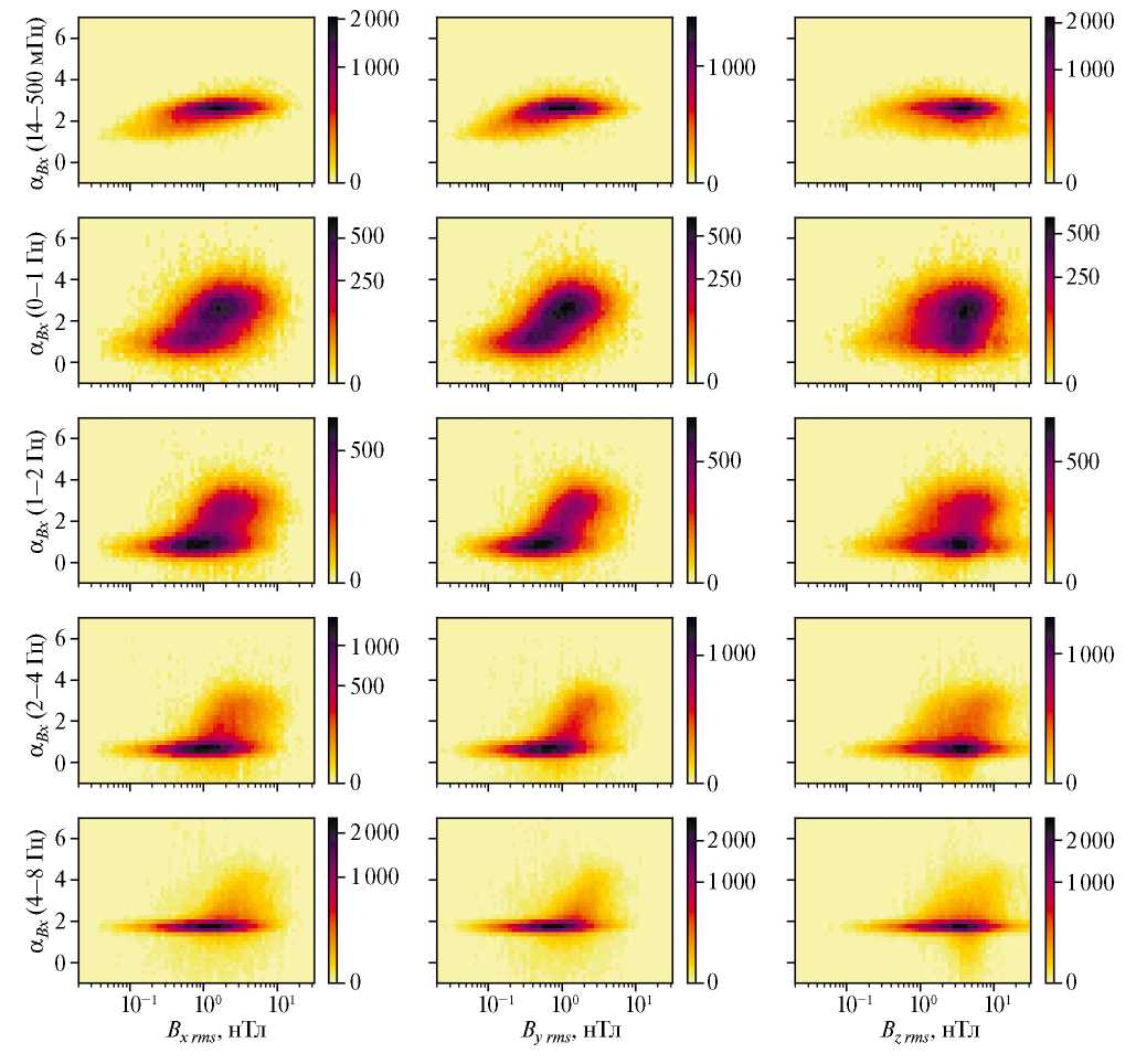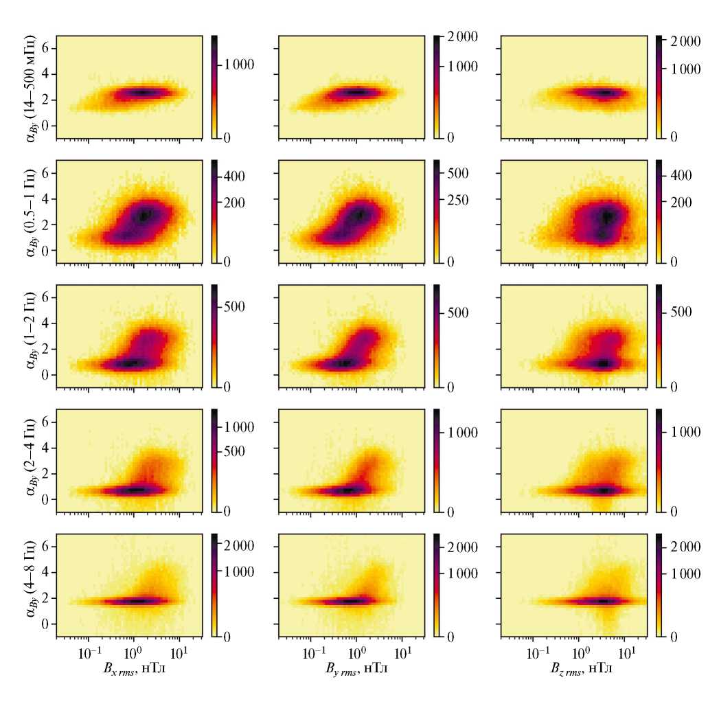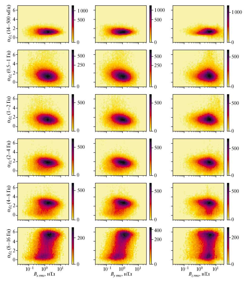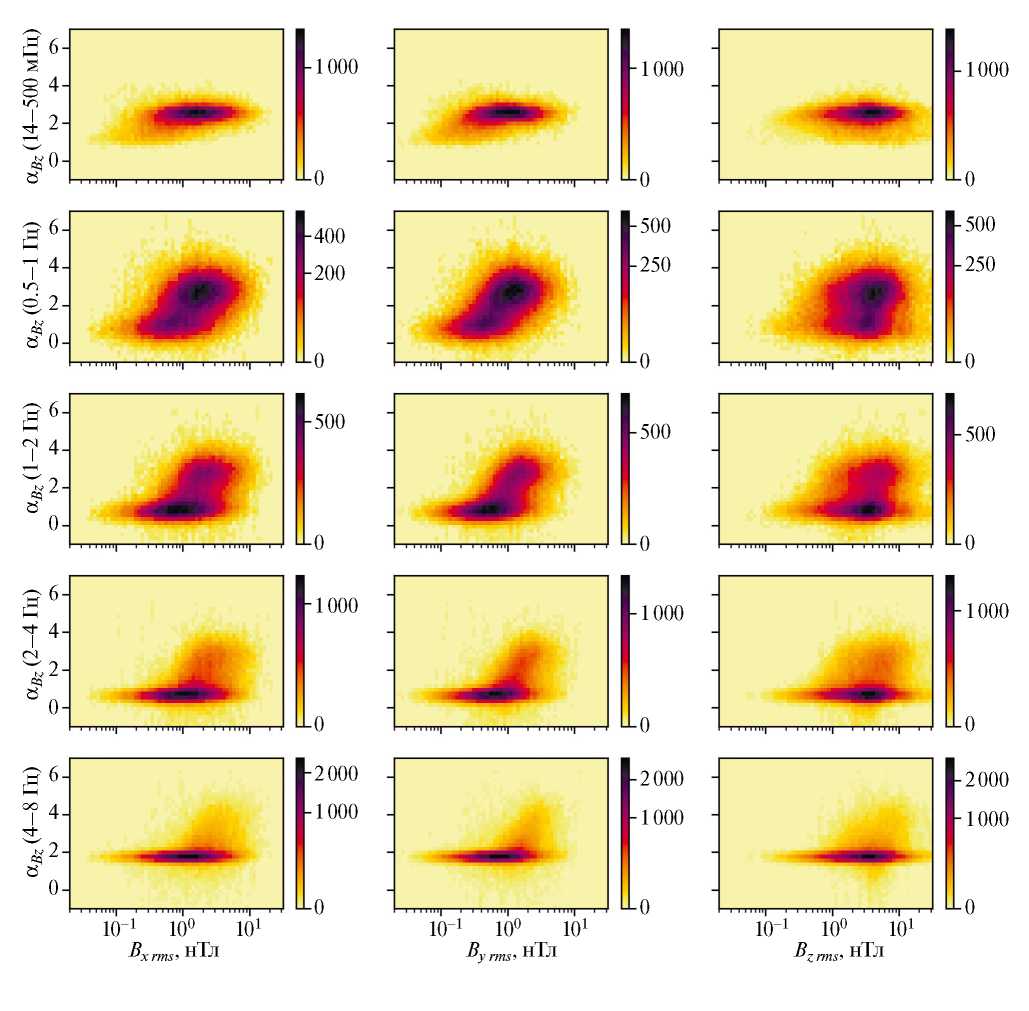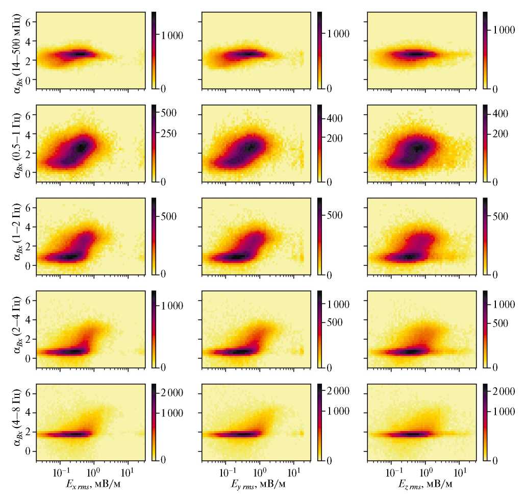 Рис. 9, П1. Двумерные гистограммы зависимости спектральных индексов z-компоненты магнитного поля от уровня флуктуаций компонент электрического поля. Цветом показано количество случаев.