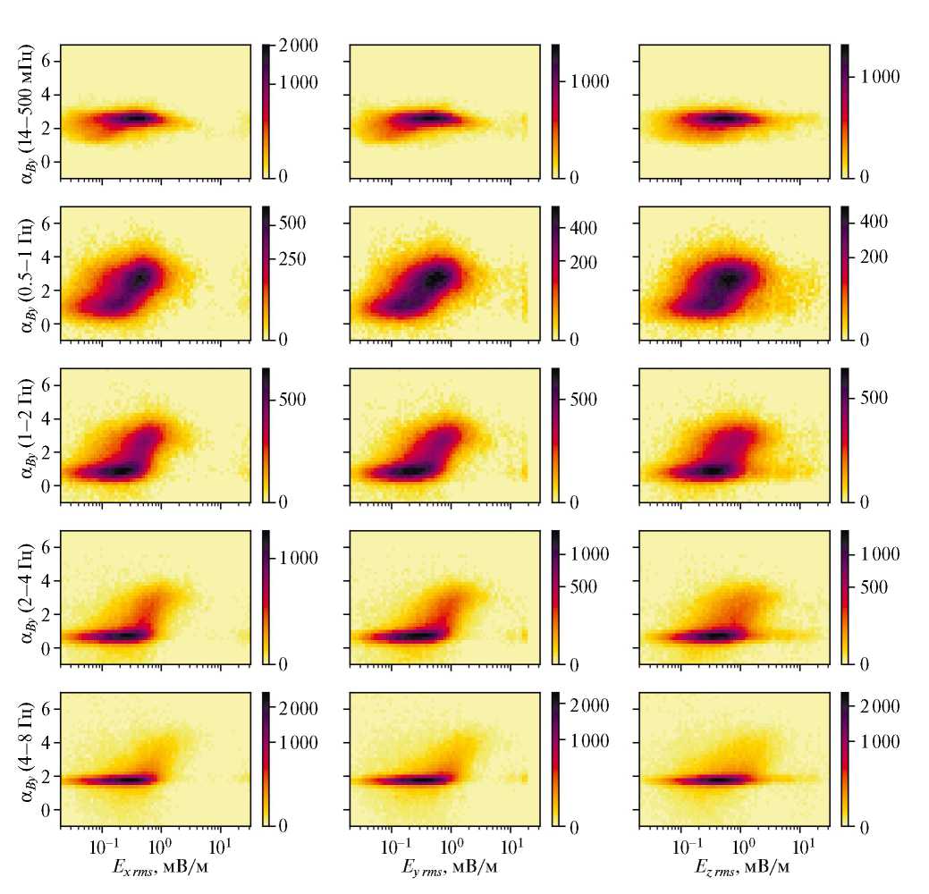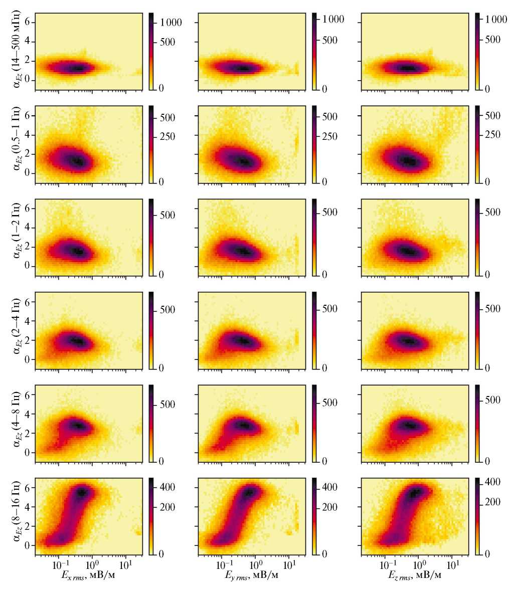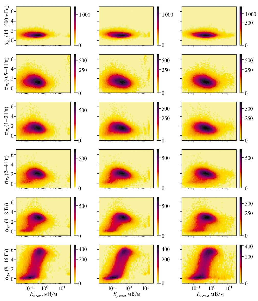 Рис. 3, П1. Двумерные гистограммы зависимости спектральных индексов z-компоненты электрического поля от уровня флуктуаций компонент электрического поля. Цветом показано количество случаев.