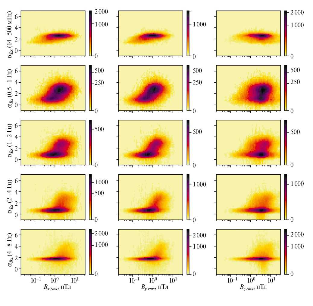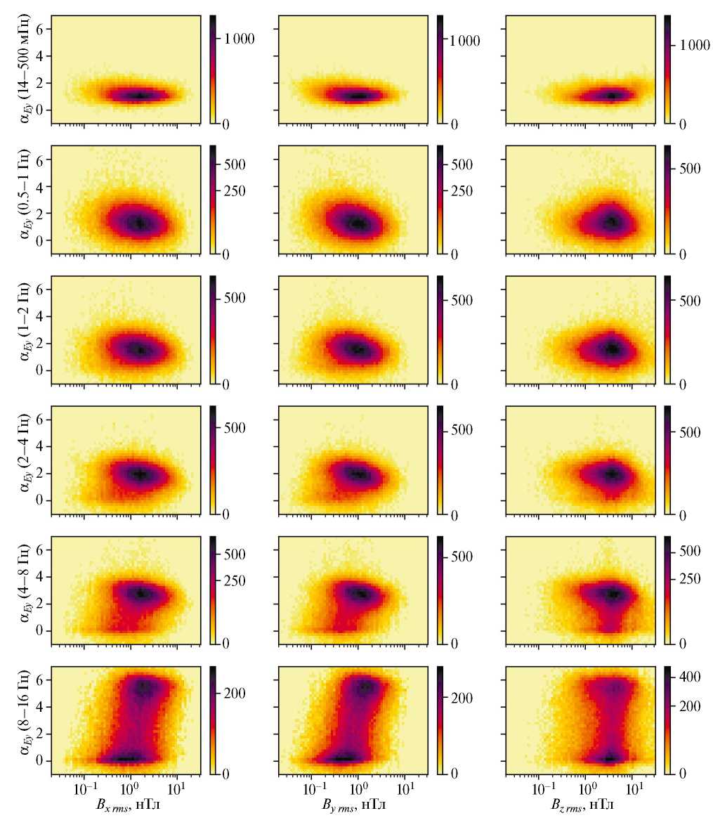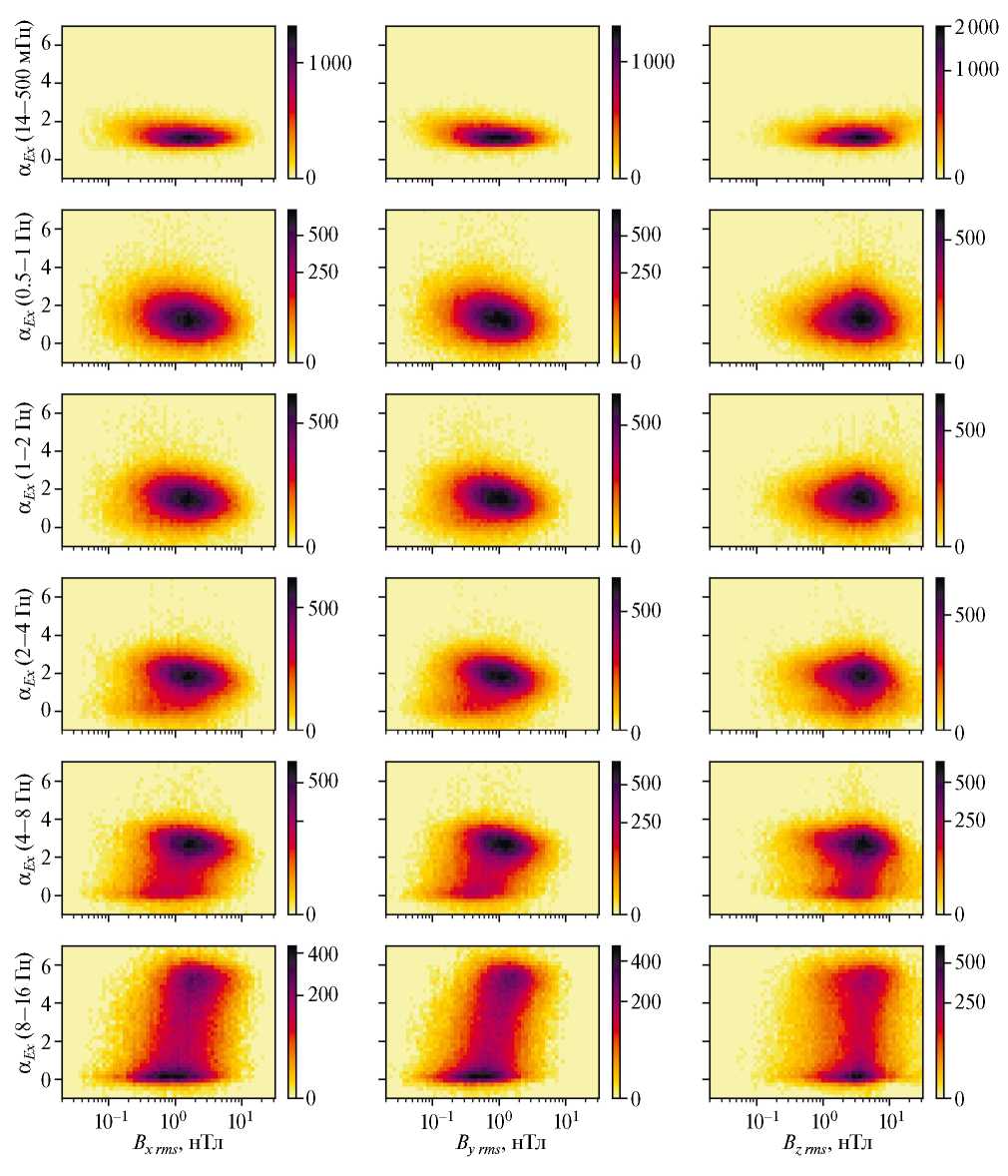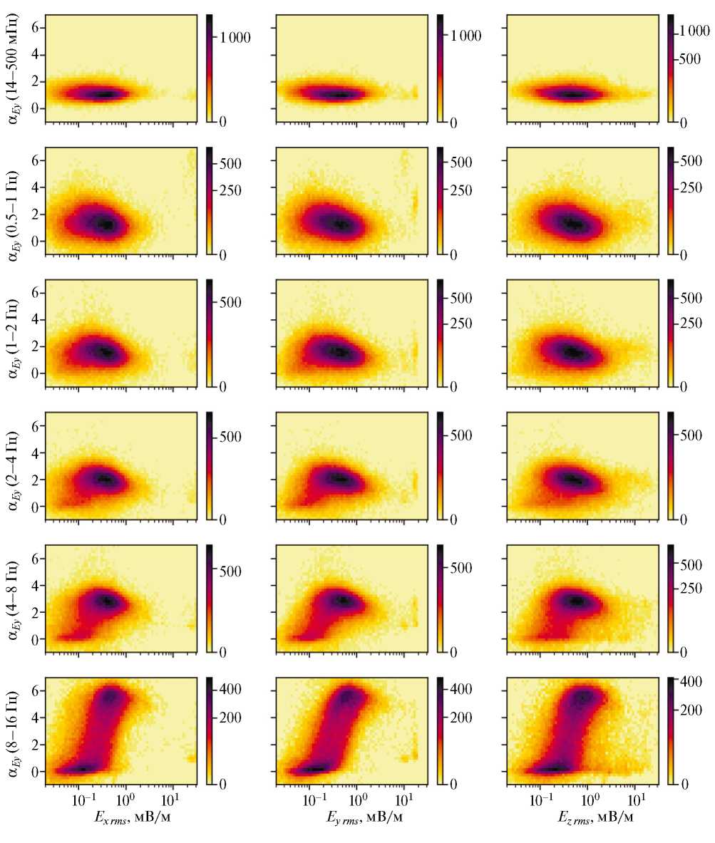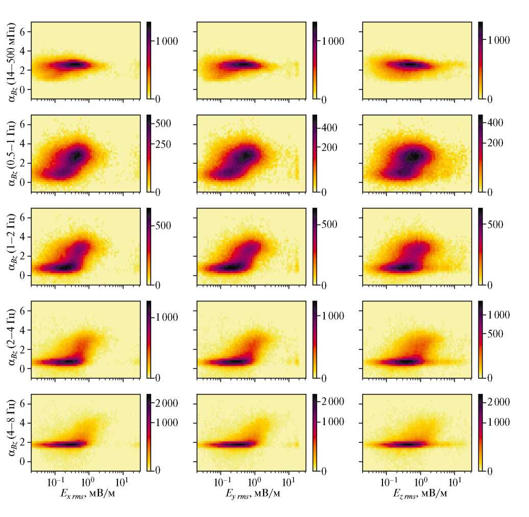 Дополнительный материал суммирует все зависимости спектральных индексов X, Y, Z компонент электрического и магнитного поля от уровня флуктуаций компонент электрического и магнитного полей. Цветом показано количество случаев.