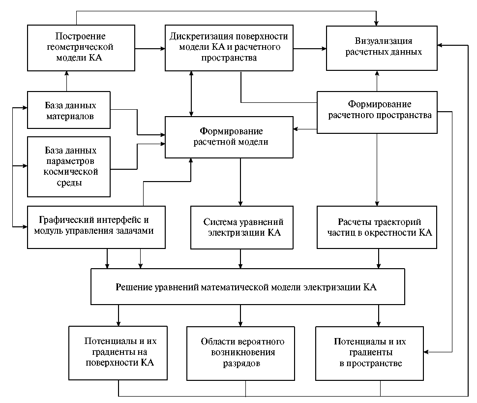 Время решения стационарных и динамических задач электризации существенно зависит от сложности модели КА, разнообразия электрофизических свойств материалов на его поверхности, параметров окружающей плазмы. На современном высокопроизводительном персональном компьютере время решения стационарных задач не превышает, как правило, 10 ч. Объем расчетов существенно зависит от количества дискретных элементов на поверхности, но практически не зависит от геометрических размеров КА.