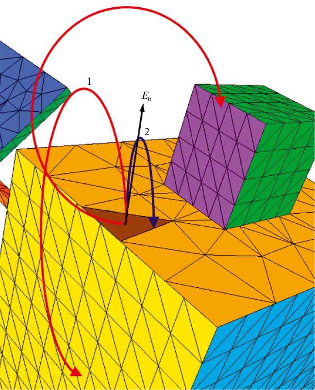 При расчете траекторий движения первичных и вторичных заряженных частиц в собственном электрическом поле КА, которое, как правило, имеет сложную структуру, и наложенном внешнем магнитном поле производится последовательное определение координат частицы на каждом временном шаге, при выборе которого важнейшими критериями становятся малые значения изменения напряженности электрического поля на временном шаге и отношения величины перемещения частицы за время шага к размеру ближайшего дискретного элемента поверхности. Эти критерии используются, в частности, при упоминавшемся выше анализе возможности возвращения эмитируемых электронов на исходный элемент поверхности или переноса их на соседние элементы (рис. 2).