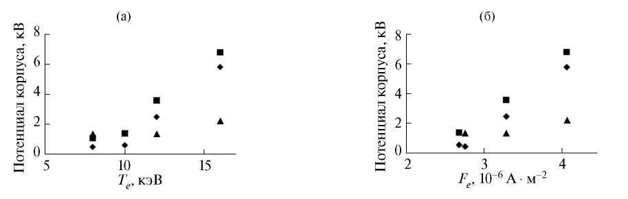 Рис. 4. Зависимость потенциала металлического корпуса КА от параметров воздействующих факторов в однокомпонентной горячей плазме: ■ — Coulomb, ♦ — NASCAP, ▲ — MUSCAT