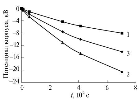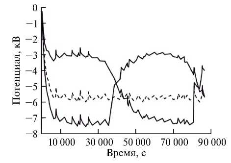 На рис. 5 показаны временные зависимости потенциалов двух элементов непроводящей поверхности КА, находящихся на освещенном и неосвещенном участках, и потенциала металлического корпуса. В данном случае стационарное состояние достигается за время ~104 с при максимальной разности потенциалов между поверхностью и корпусом 6‒7 кВ.