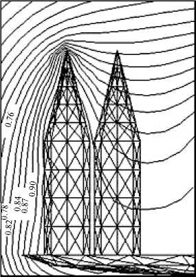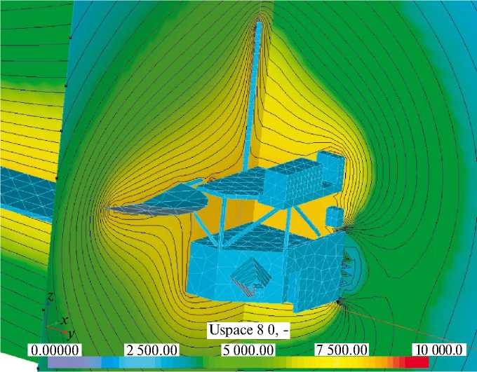 Для визуализации структуры электрического поля обычно используются сечения полученной трехмерной картины двумя плоскостями, как это показано на рис. 7. При необходимости детализации структуры электрического поля в непосредственной близости от поверхности КА могут быть применены укрупненные расчетные геометрические модели. Это позволяет проанализировать особенности распределения потенциала около острых элементов конструкции и тем самым более точно указать возможные места возникновения ЭСР. Пример результата такого расчета приведен на рис. 8. Здесь левый элемент конструкции пересекается плоскостью сечения, в которой построена карта распределения потенциала, а правый находится позади этой плоскости.