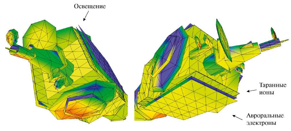 Поскольку в данном случае дифференциальное заряжение КА происходит под действием нескольких анизотропных факторов, вариации потенциала по поверхности оказываются, как правило, значительными. Наибольшие отрицательные потенциалы возникают на участках диэлектрической поверхности, подвергающихся прямому воздействию авроральных электронов. Это иллюстрируется рис. 9, на котором темные участки соответствуют меньшим отрицательным потенциалам, снижение которых обусловлено прямым солнечным освещением или воздействием потока таранных ионов. При анализе динамики заряжения КА в авроральных областях учитывается сильное отличие постоянных во времени процессов общего и дифференциального заряжения, из-за чего, в частности, равновесное дифференциальное заряжение КА за время пересечения ярких дуг и лучей полярных сияний (~0.1 с) может не достигаться.