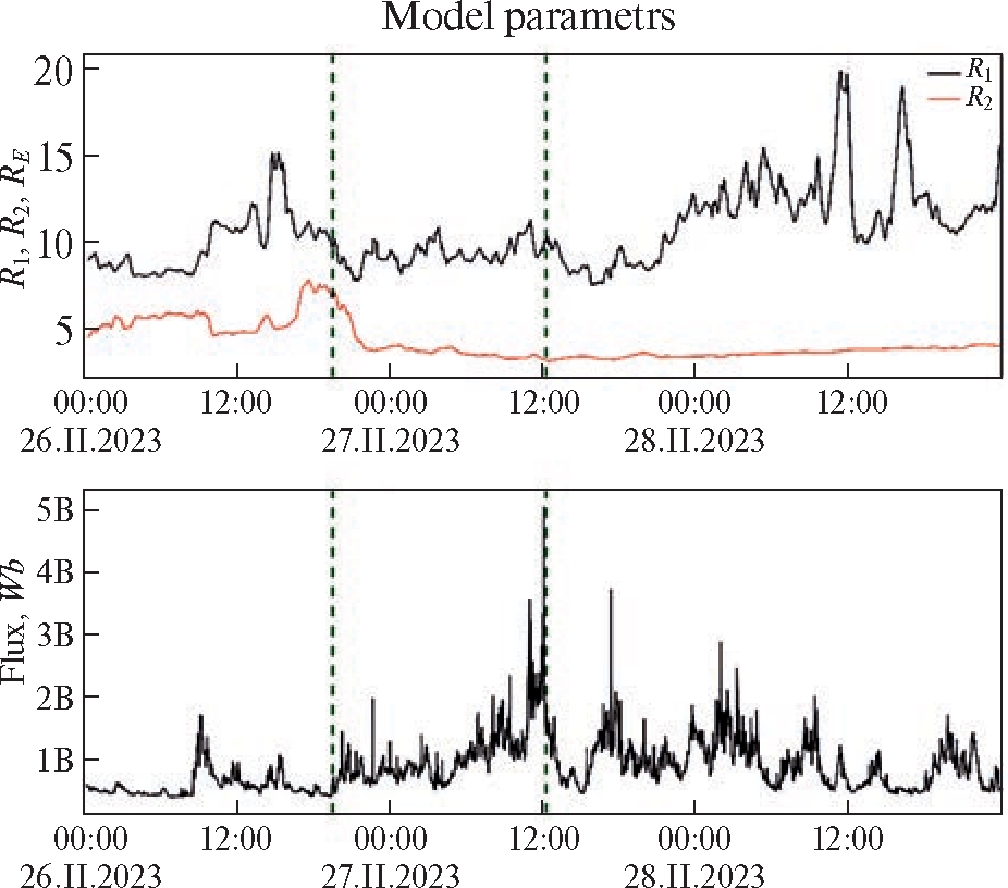 Для описания магнитной бури 26–28.II.2023 выбрали параболоидную модель магнитосферы A2000. В ней магнитосферное магнитное поле состоит из двух слагаемых. Первое порождается внутриземными токами, второе – токами, текущими в магнитосфере. Внутриземное магнитное поле вычисляется по модели IGRF 13 (http://www.ngdc.noaa.gov/IAGA/vmod/igrf.html), в которой оно представлено в виде разложения по сферическим гармоникам [16].