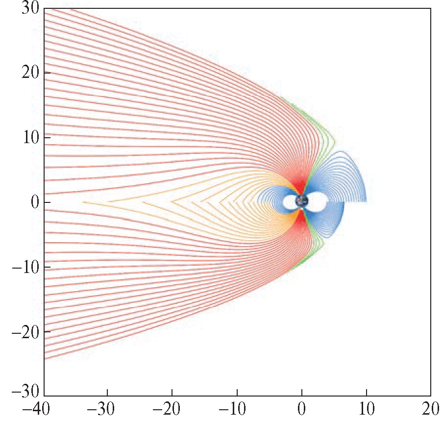 Рис. 10. Сжатие магнитосферы до геостационарной орбиты при приходе фронта коронального выброса массы во время внезапного начала магнитной бури в 19:30 UT 26.II.2023. Показано соответствующее изменение структуры магнитосферы. Нарисованы модельные силовые линии в сечении полдень – полночь в системе координат GSM для двух состояний магнитосферы, при которых расстояние до подсолнечной точки равно 10 RE (а) и 6.6 RE (б) соответственно. По осям расстояние выражено в RE. Различные типы силовых линий маркированы разными цветами. Линии каспа, которые соединяют магнитопаузу и ионосферу, окрашены зеленым цветом, открытые линии полярной шапки, уходящие в торцевое сечение хвоста магнитосферы, – красным, силовые линии аврорального овала, которые соединяют токовый слой хвоста и ионосферу, – оранжевым, а замкнутые силовые линии, которые заполняют сердцевину магнитосферы и пересекают экваториальную плоскость ближе к Земле, чем располагается передний край токового слоя, – синим.