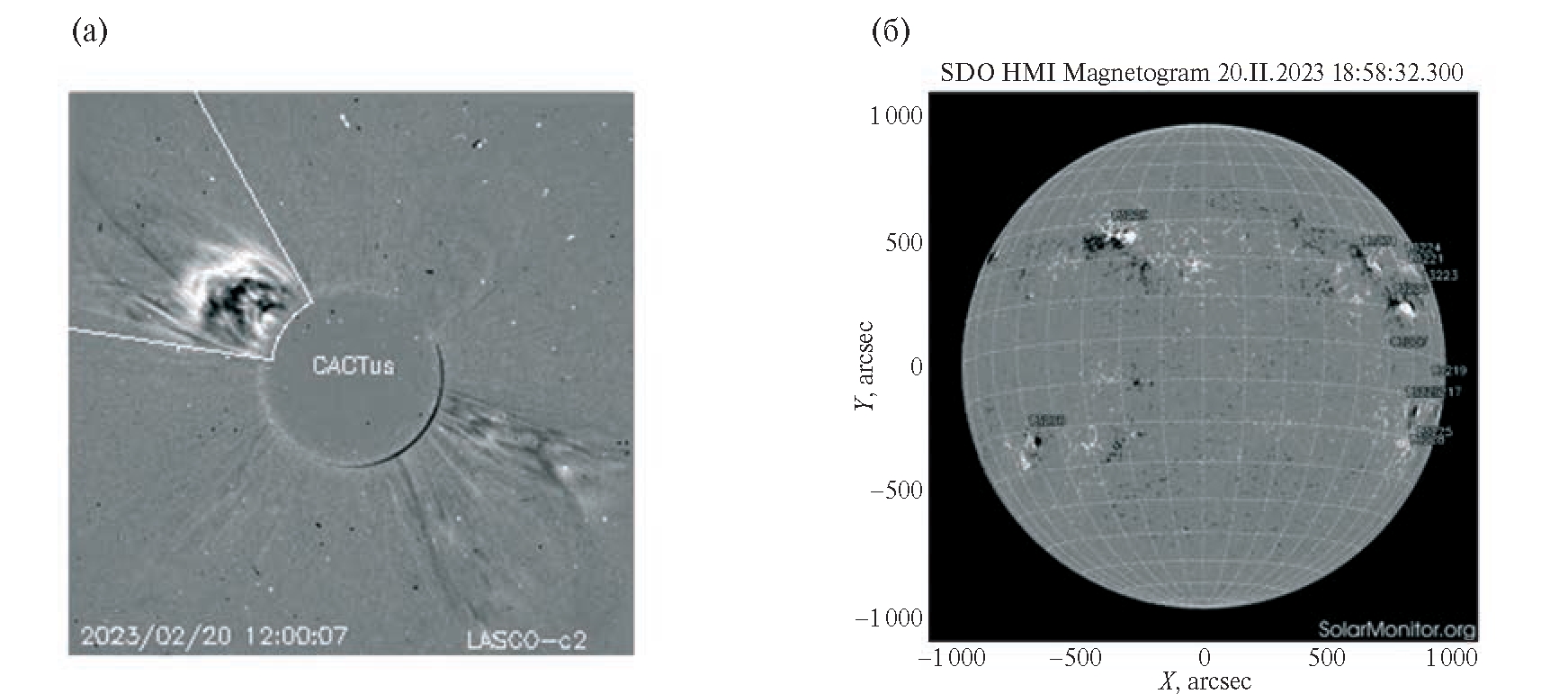 Рис. 5. Пример КВМ, зарегистрированного CACTus (LASCO/C2) 20.II.2023 в 09:48 UT (а), и магнитограмма Солнца по данным SDO HMI на этот день (б).