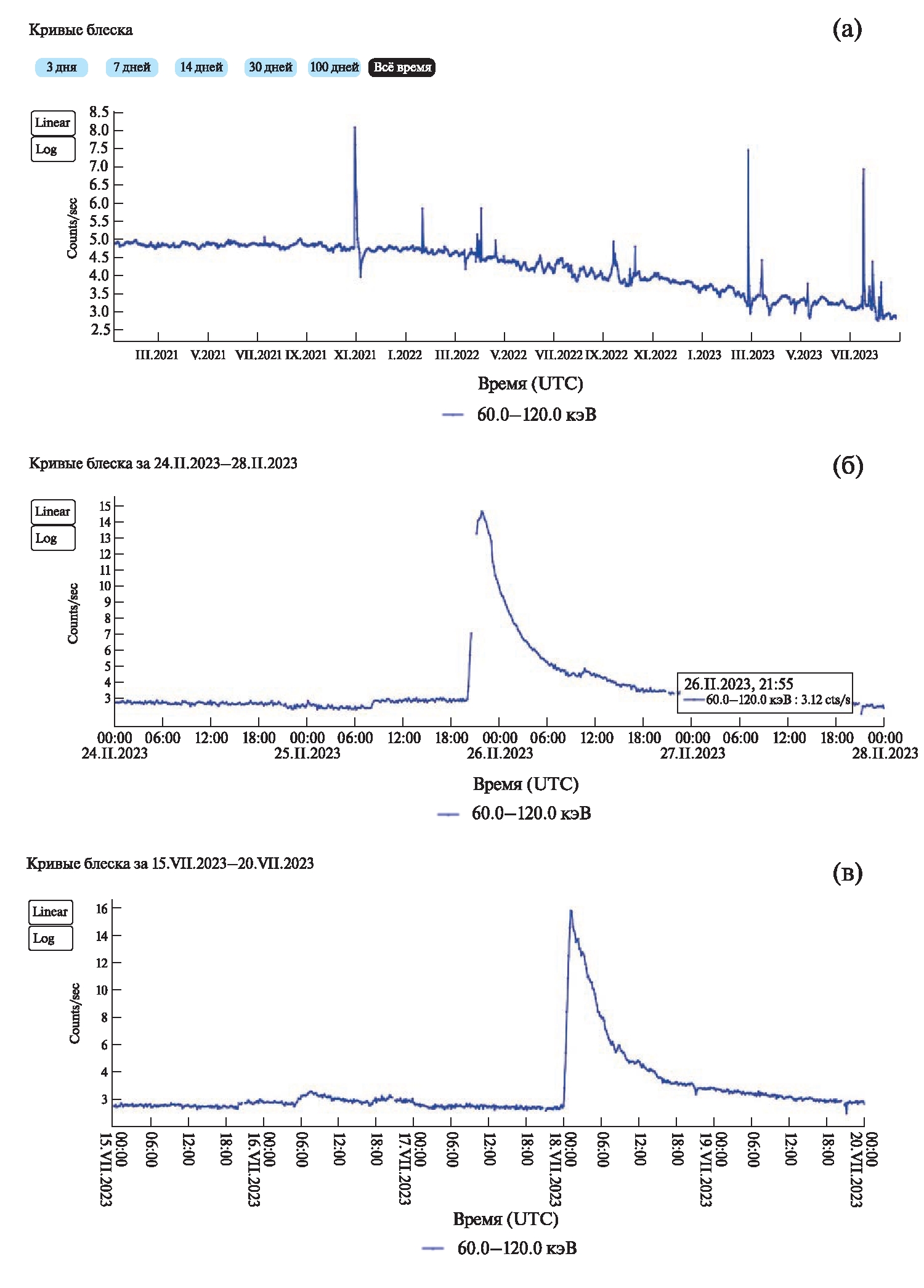 На рис. 1а представлен скриншот экрана в момент, когда была построена кривая блеска монитора радиационной обстановки с начала января 2021 г. по конец августа 2023 г. На таком масштабе времени отлично виден эффект модуляции космических лучей в цикле солнечной активности (октябрь 2021 г., фаза роста вблизи минимума 24–25-го циклов, июль 2023 г. – фаза роста вблизи максимума цикла). Глубина модуляции зависит от энергии галактического космического излучения (ГКЛ) и изменяется от единиц процентов на экваториальных нейтронных мониторах до ≈20% на полярных нейтронных мониторах, до сотен процентов при измерениях в стратосфере и до порядка величины в открытом космосе [4]. На рис. 1а видны три возрастания, которые превышают вариации фона ГКЛ в цикле активности, имеют сопоставимую интенсивность и связаны с приходом солнечных космических лучей. Вклад одного мощного СПС в радиационную дозу может превышать суммарный вклад от ГКЛ за длительный период. Именно такие события нуждаются в прогнозировании по наблюдениям в реальном времени для обеспечения безопасной космической деятельности. Меньшие события представляют лишь ограниченный, в основном академический интерес.