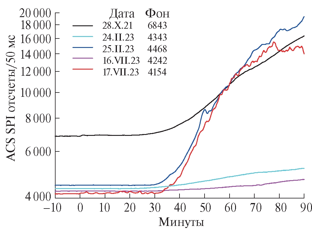 На рис. 2 показан сглаженный за одну минуту темп счета ACS SPI за 50 мс в событиях 1, 3, 4, 6а и 7, глубина модуляции ГКЛ между 28 октября 2021 г. и 17 июля 2023 г. составляет 39.3%. Это показывает, что ACS SPI чувствителен к протонам меньшей энергии, чем полярные нейтронные мониторы (энергия атмосферного обрезания ~450 МэВ). Интенсивность протонов ГКЛ >100 МэВ в максимуме JГКЛ ~ 0.1 (см2 с ср)−1 соответствует фоновому темпу счета Nфон1 = 6843 имп/50 мс (28 октября 2021 г.), в СПС с амлитудой больше модуляции ГКЛ поток протонов >100 MэВ должен быть (см2 с ср)−1.