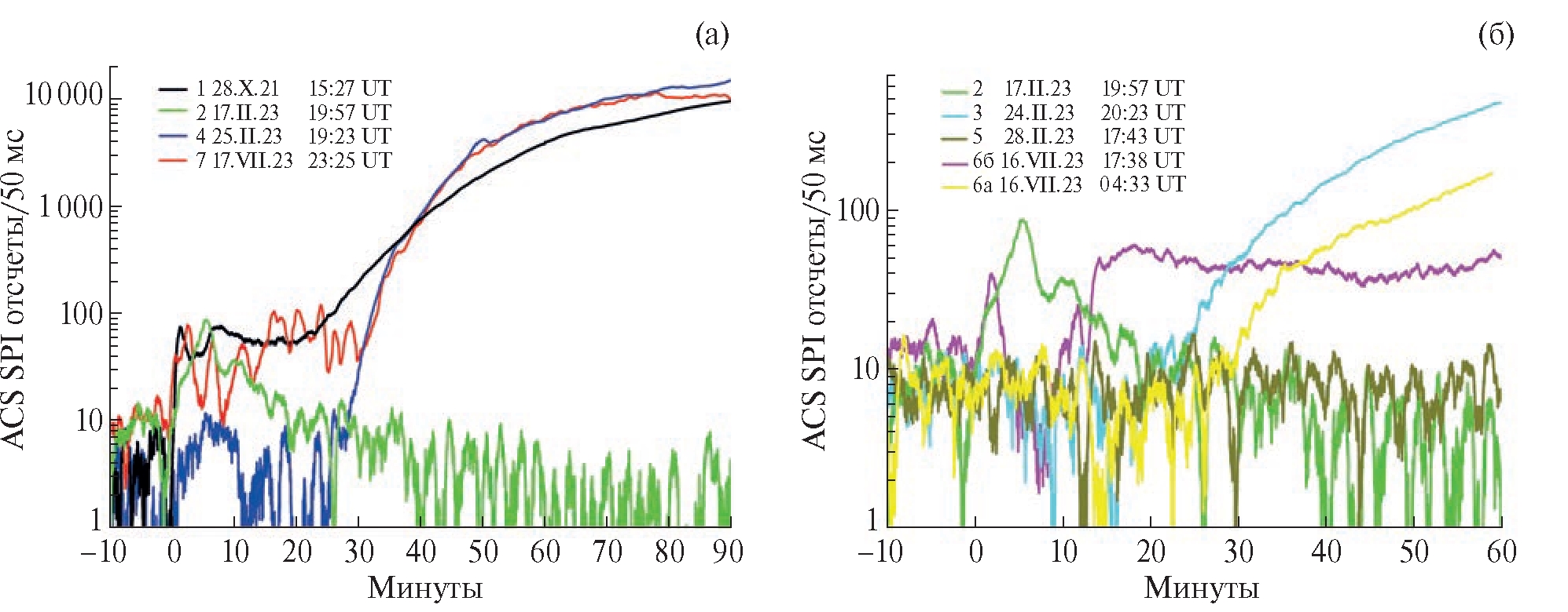 Протонные возрастания событий 1, 4 и 7 различались временем первого прихода протонов и темпом роста счета ACS SPI. По классификации времени прихода [6] эти события относятся к «поздним» и медленным. Различие оценки времени первого прихода в 5 мин в событиях 4 и 7 разумно приписать влиянию HXR-фона при практически идентичных кривых блеска после +30 мин. С другой стороны, могли различаться и темпы ускорения протонов в случаях 4 и 7. Протонное возрастание (вспышка 4) началось на +25 мин, а в событии 7 на +30 мин. Время запаздывания прихода протонов 100 МэВ при длине распространения 1.3 а. е. ~17 мин. Протоны должны были выйти в МП не позднее +8 мин в событии 4 или +13 мин в событии 7. Длительность ускорения протонов до 100 МэВ была ~480 c (вспышка 4) и ~780 c (вспышка 7), а минимальный темп ускорения протонов 100 МэВ/480 с = 0.2 МэВ/с и 100 МэВ/780 с = 0.1 МэВ/с.