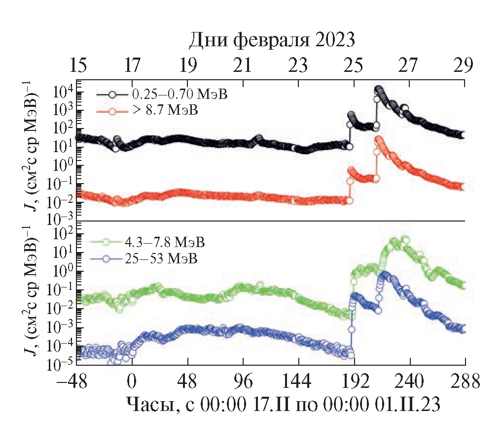 Рис. 4. Потоки протонов и электронов, зарегистрированные SOHO/EPHIN15–28 февраля 2023 г.