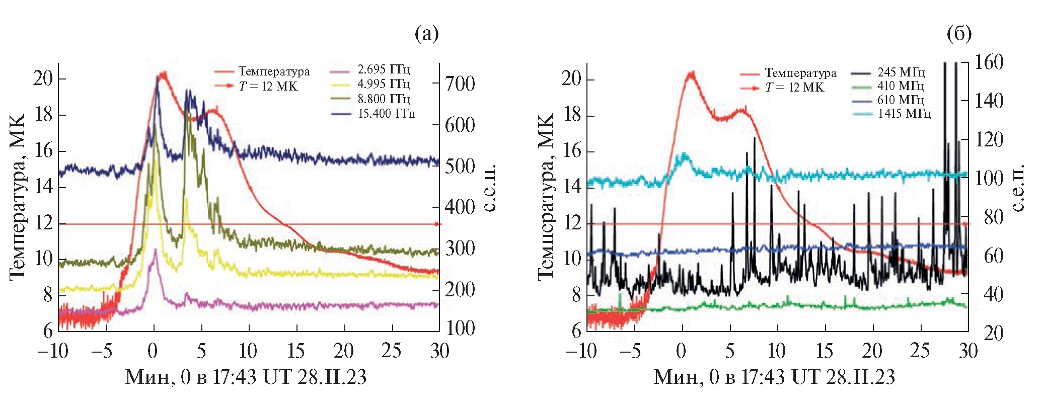 Рис. 6. Вспышка 5 (М8.6) 28 февраля 2023 г.: (а) температура вспышечной плазмы и поток радиоизлучения 15.4– 2695 МГц, (б) температура вспышечной плазмы и поток радиоизлучения 1415–245 МГц.