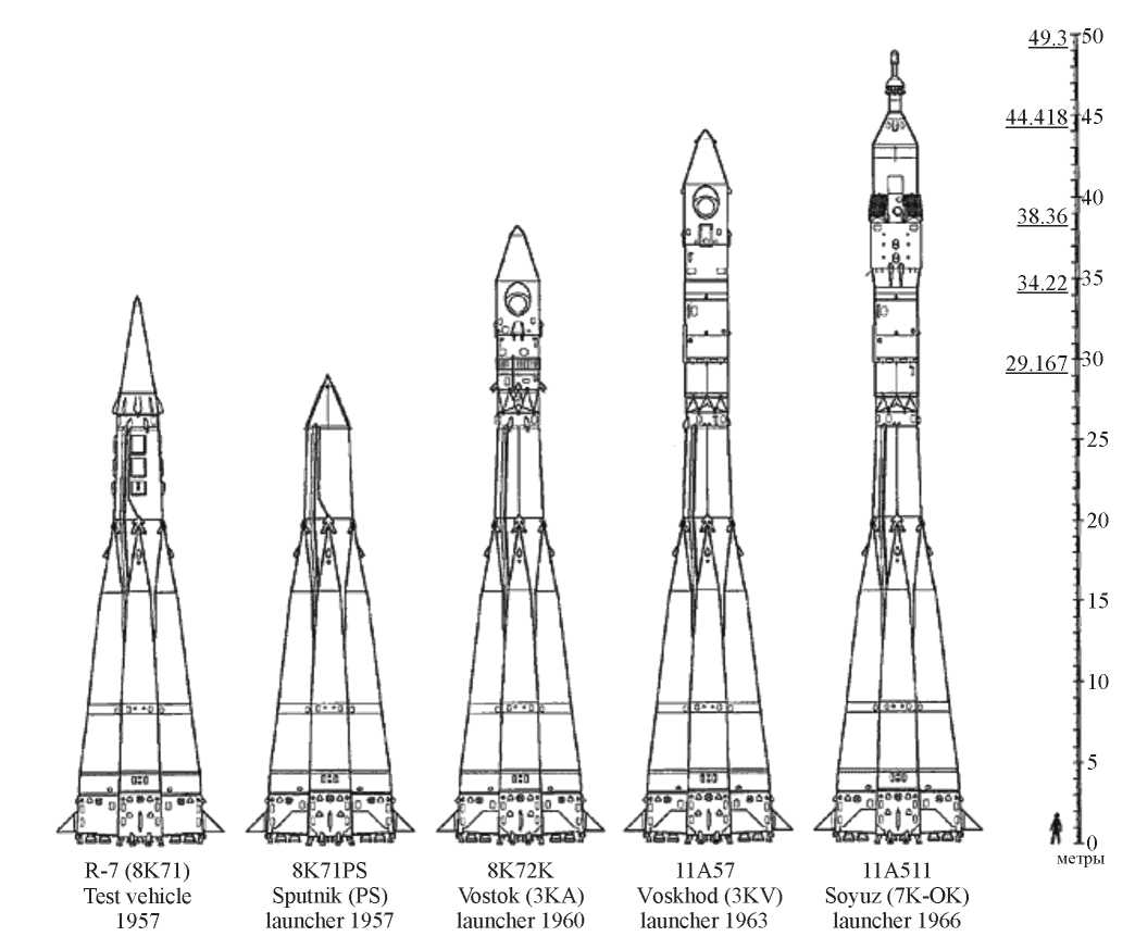 Рис. 1. Советские космические корабли на основе ракеты Р-7.
